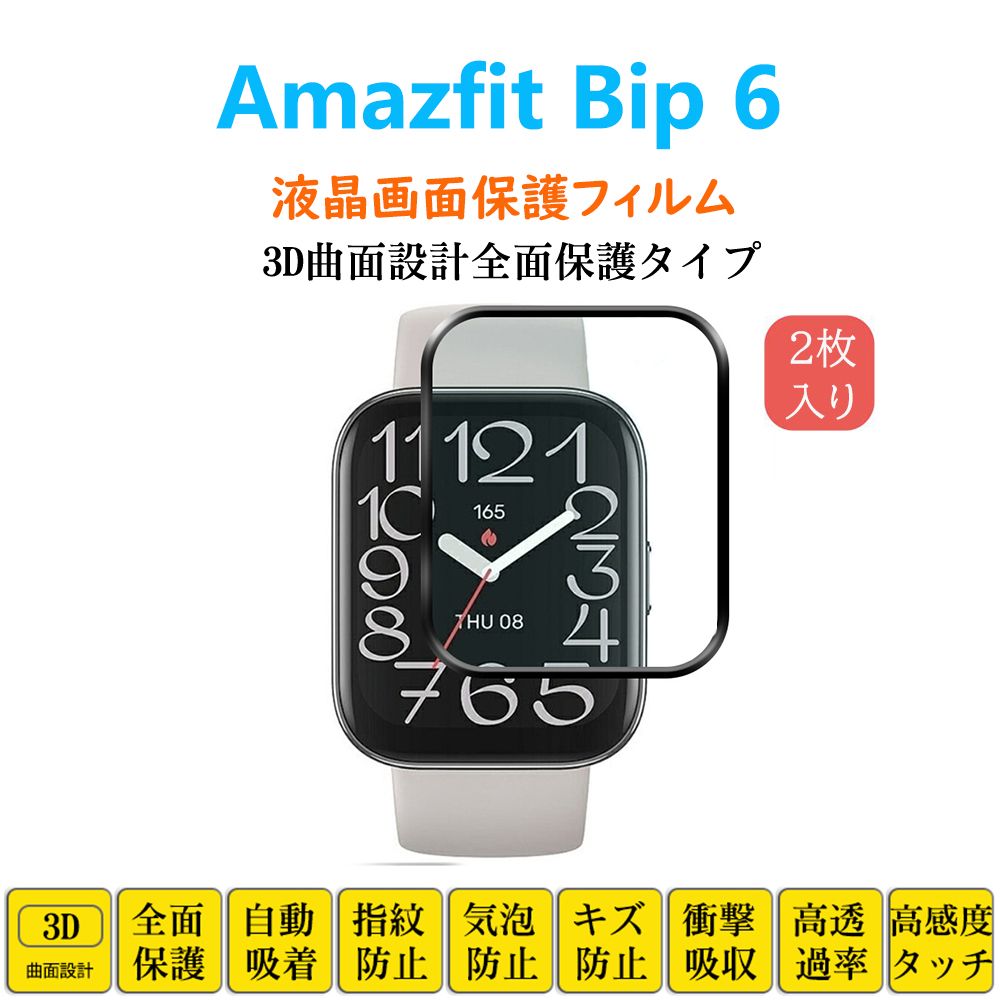 2枚 Amazfit Bip 6 スマートウォッチ 保護フィルム アマズフィット フルカバー 衝撃吸収 自動吸着 指紋防止 液晶画面保護シール スクリーンプロテクター