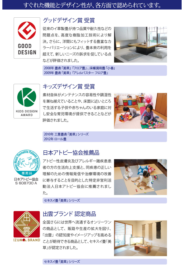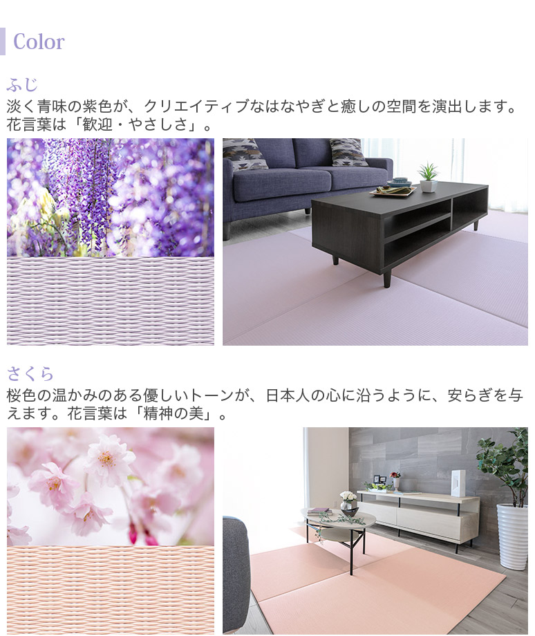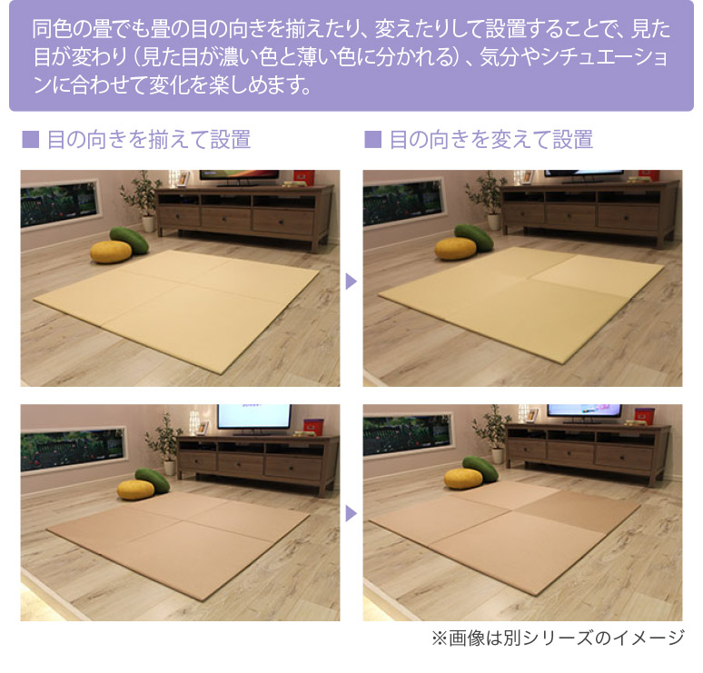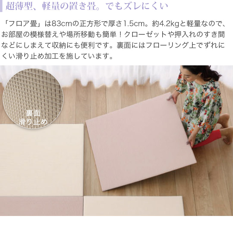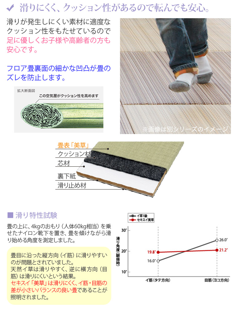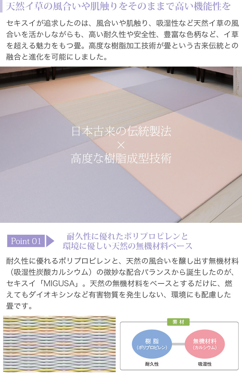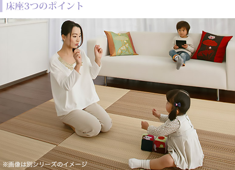 | 素材 | ・畳表:ポリプロピレン、炭酸カルシウム他 ・芯材:中密度木質繊維圧縮板(F☆☆☆☆) ・内クッション材:ポリエステル製不織布 ・滑り止め:ポリエチレン発泡体 |