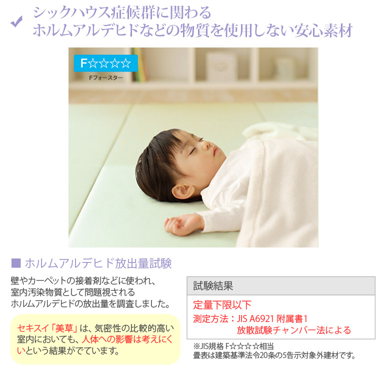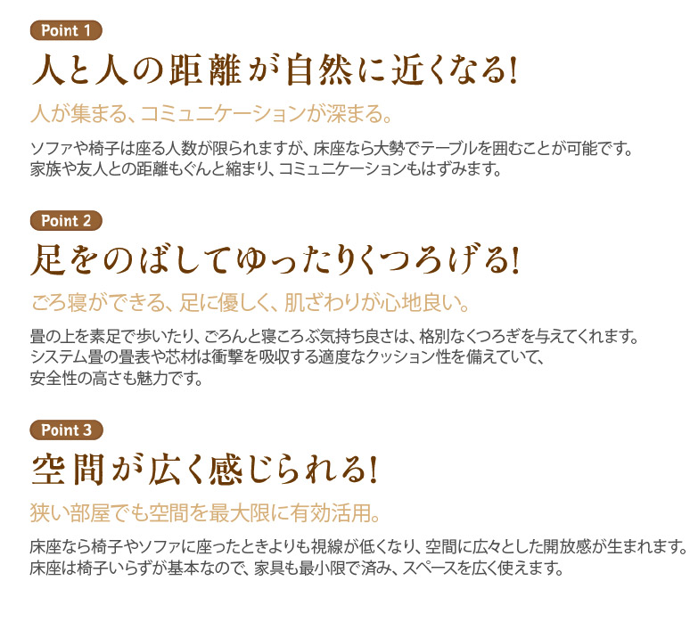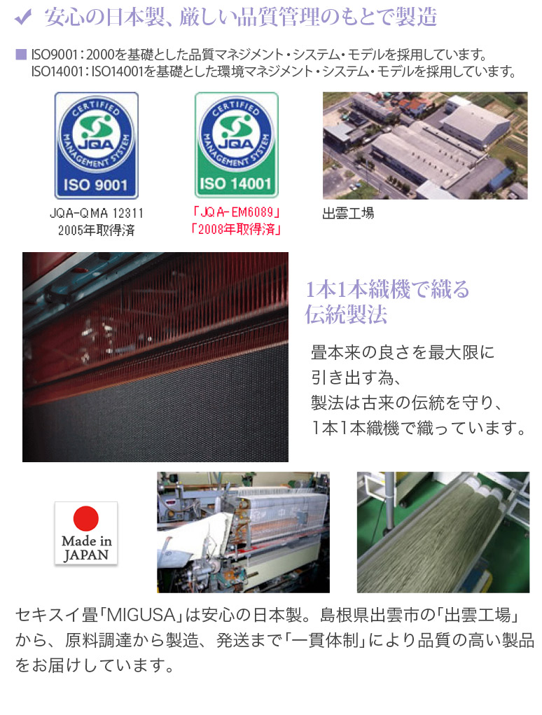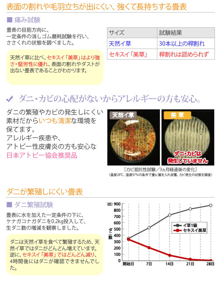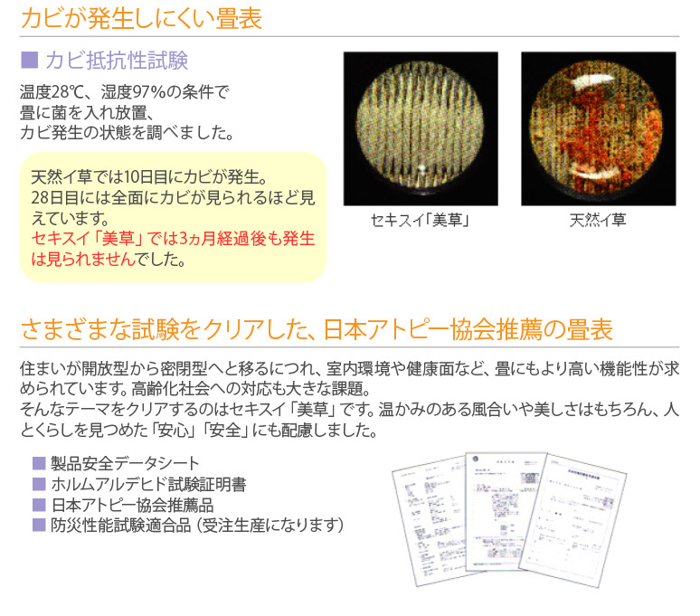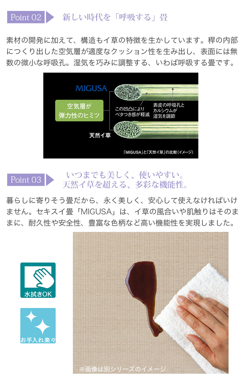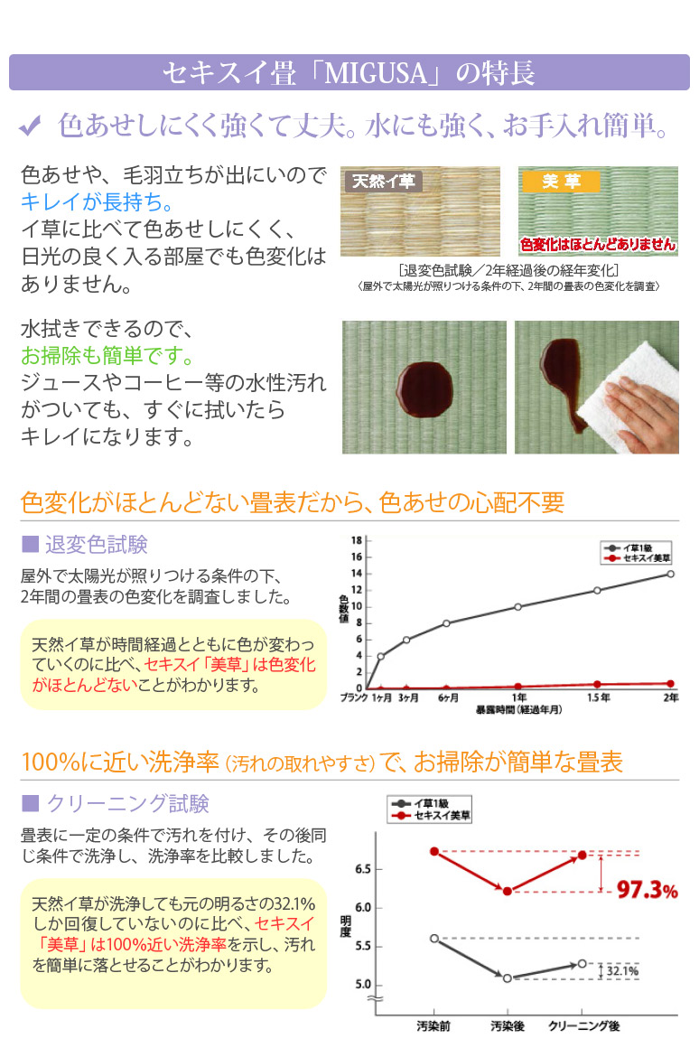 | 素材 | ・畳表:ポリプロピレン、炭酸カルシウム他 ・芯材:中密度木質繊維圧縮板(F☆☆☆☆) ・内クッション材:ポリエステル製不織布 ・滑り止め:ポリエチレン発泡体 |