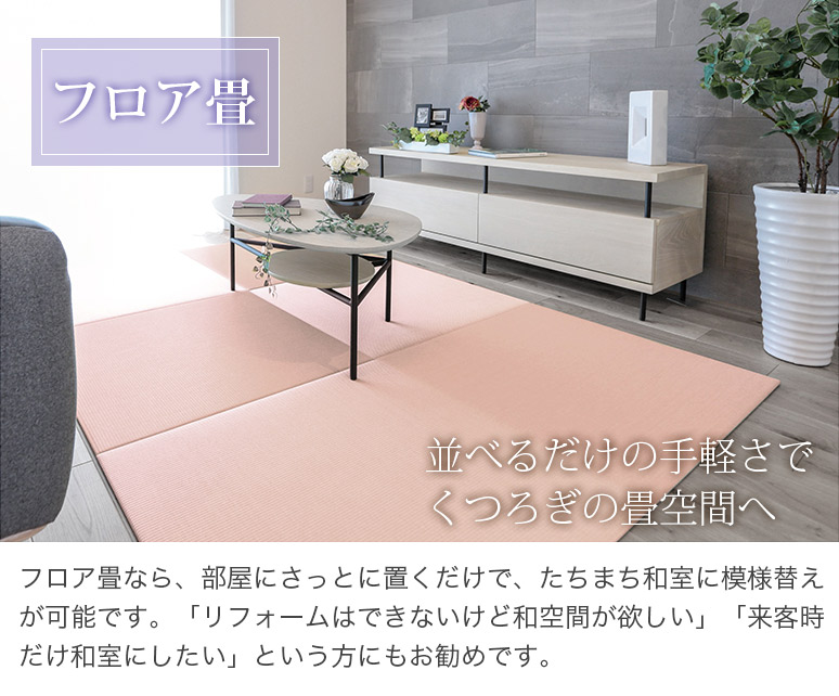 | ● ここがポイント ● 〇フローリング等の部屋の床に直接置くことができる、セキスイ畳「美草」ブランドのフロア畳(置き畳)「はんなり」シリーズです。 〇フロア畳なら、部屋にさっとに置くだけで、たちまち和室に模様替えが可能です。 〇「リフォームはできないけど和空間が欲しい」「来客時だけ和室にしたい」という方にもお勧めです。 〇「はんなり」シリーズは、ホワイトを基調にした清潔感のあるインテリアに最適な4色のラインナップ。違ったカラーのフロア畳を組み合わせることにより、お好みのインテリアテイストにアレンジできます。 〇同じカラーでも、表面の目の向きを変えて置くことにより、畳の雰囲気をかえることができます。 〇ソファのあるリビングにも違和感なくマッチするので、時にはソファ、時には畳でゆっくりと、様々な寛ぎ空間を作り出すことができます。 〇畳の持つ温かい肌触りはヒートショックにも効果的です。 〇従来の畳を表現するため、1本1本を織機で織り合わせる製法を採用。伝統的製法と新素材の融合により、畳本来の風合いを再現しています。 〇裏面には滑り止め加工を施し、フローリングの上に置いても滑りにくくなっており、お子様や高齢の方にも安全です。 〇従来のお掃除ではあきらめていた汚れも、サッと拭き取ることができるので、お掃除が簡単です。 |