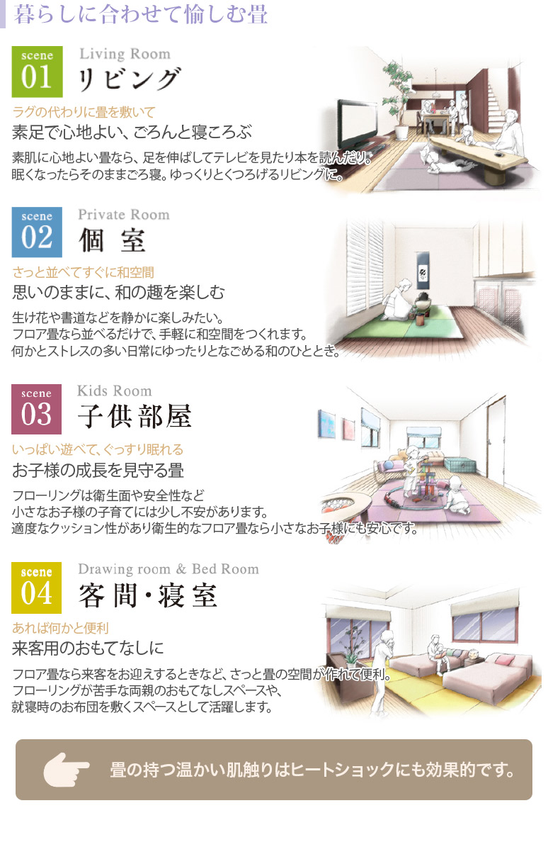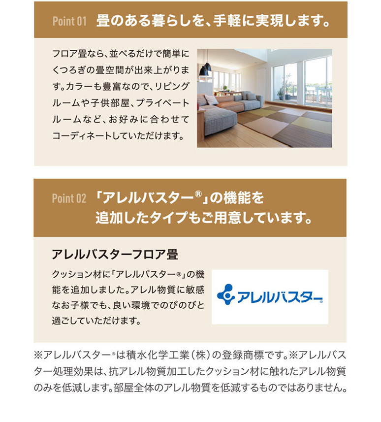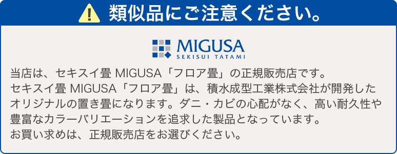 | ※ 注意事項 ※ *当製品は置き畳としてフローリングの上に置いて使用するものです。敷き込む(施工)タイプのものではありません。 *床暖房フロアー等での直置きの使用は避けて下さい。畳の変形や変質するおそれがあります。 ※ご注文時における注事事項※ 積水フロア畳のご注文につきましては、ご注文頂く商品の枚数 (セット数)とカラーをよくご確認の上、ご注文頂きます様、お願い致します。 尚、カラー違いのセット組みにつきましては、対応しておりません。ご了承の程、 宜しくお願い致します。 |