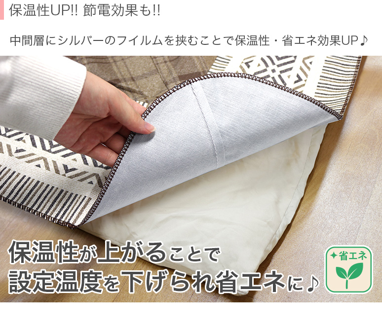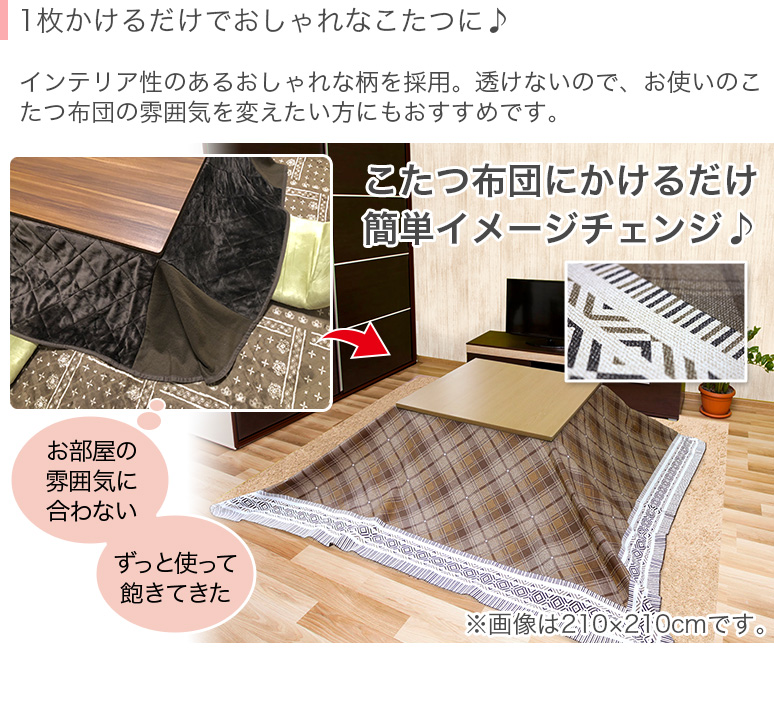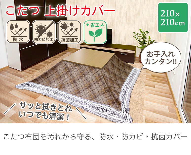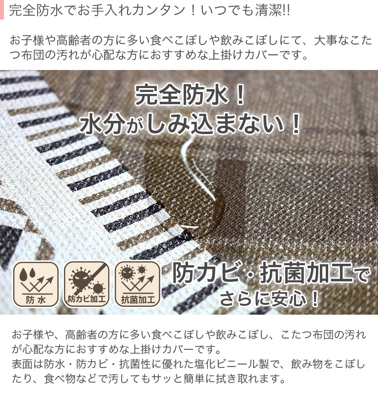 | ● ここがポイント ● 〇お子様や高齢者の方に多い食べこぼしや飲みこぼしにて、大事なこたつ布団の汚れが心配な方におすすめな上掛けカバーです。 〇表面は防水・防カビ・抗菌性に優れた塩化ビニール製です。 〇完全防水で、保温力にも優れています。 〇インテリア性のあるおしゃれな柄を採用。柄物は透けないので、お使いのこたつ布団の雰囲気を変えたい方にもおすすめです。 |