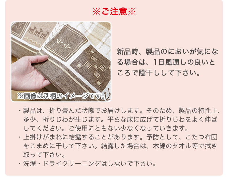 | ※ 注意事項 ※ ※新品時、製品のにおいが気になる場合は、1日風通しの良いところで陰干しして下さい。 ※上掛けがまれに結露することがあります。予防として、こたつ布団をこまめに干して下さい。 ※結露した場合は、木綿のタオル等で拭き取って下さい。 ※洗濯・ドライクリーニングはしないで下さい。 |