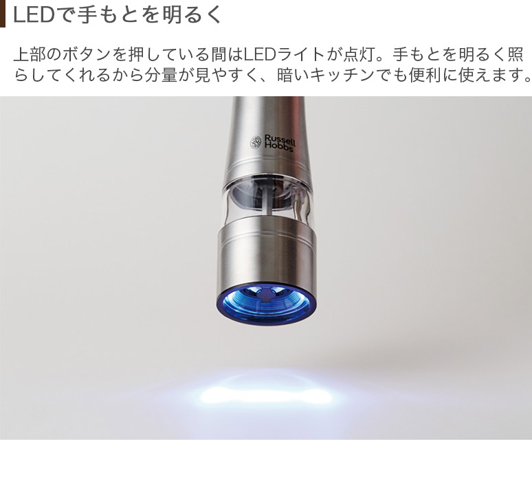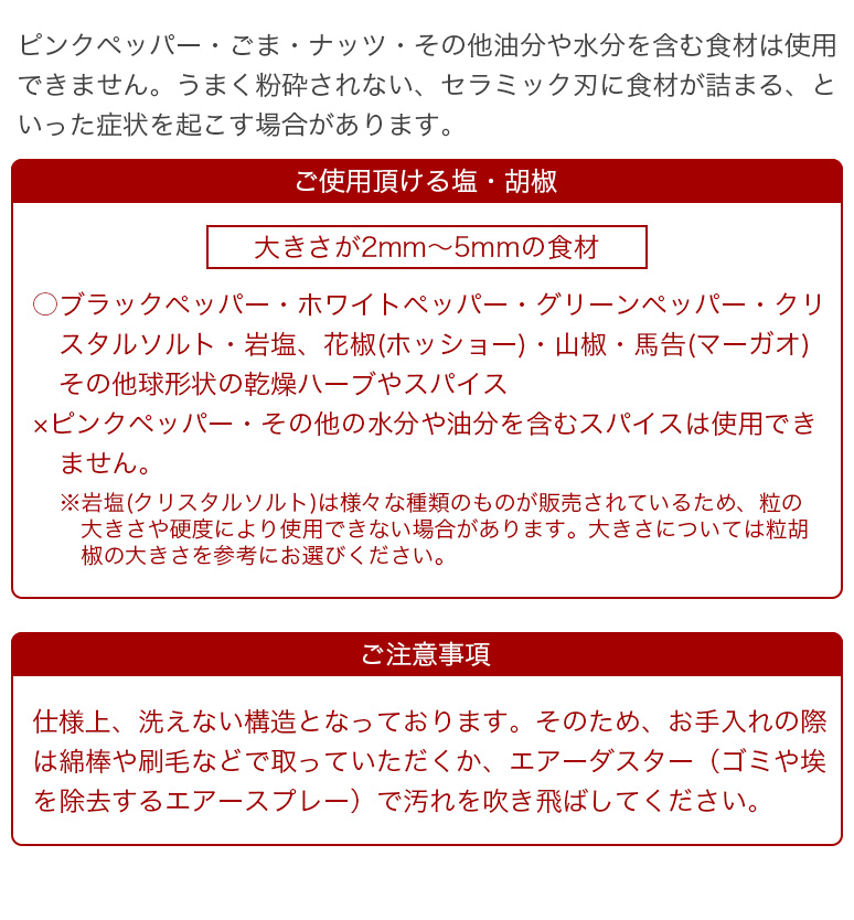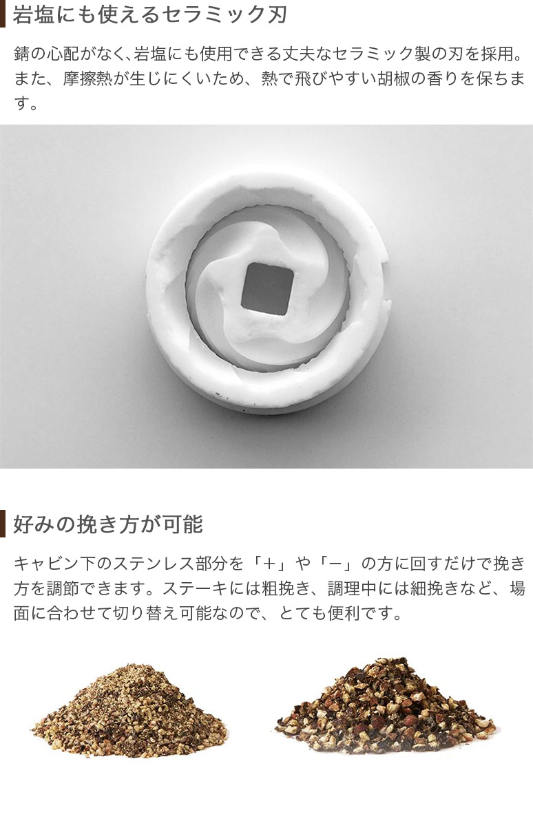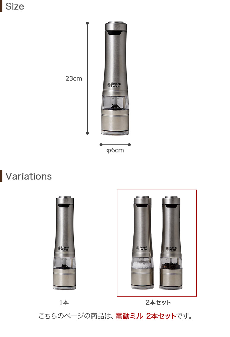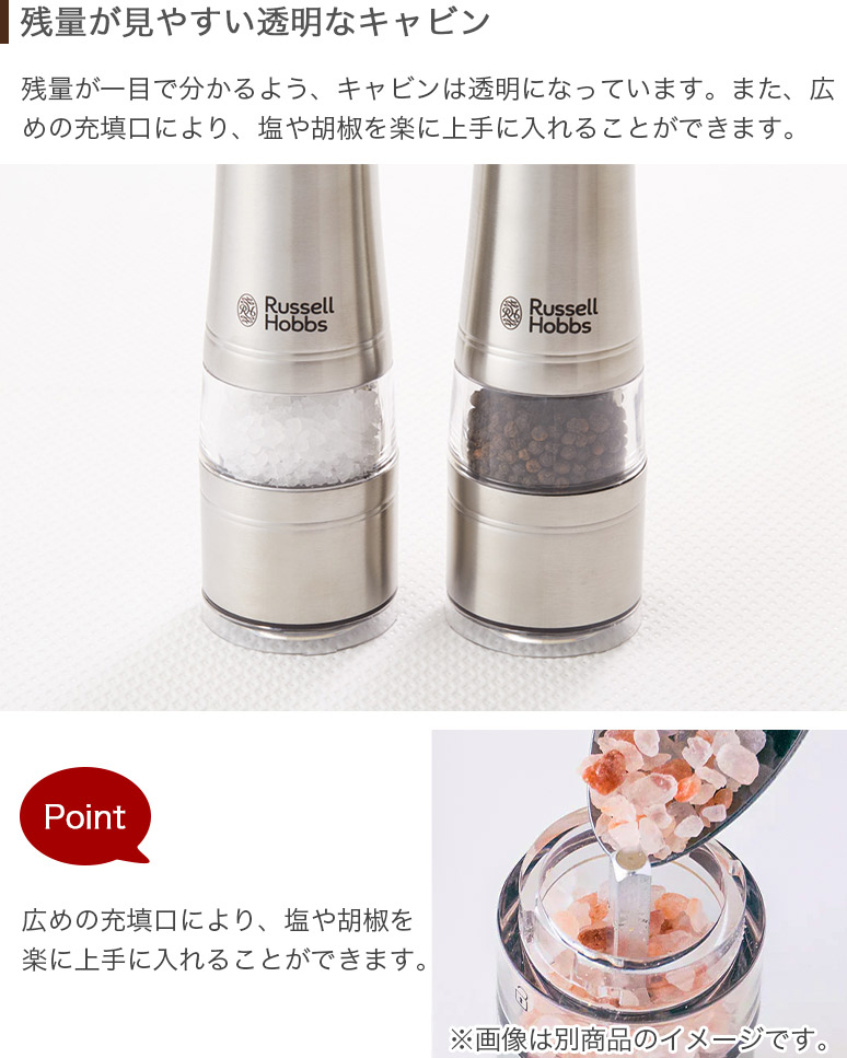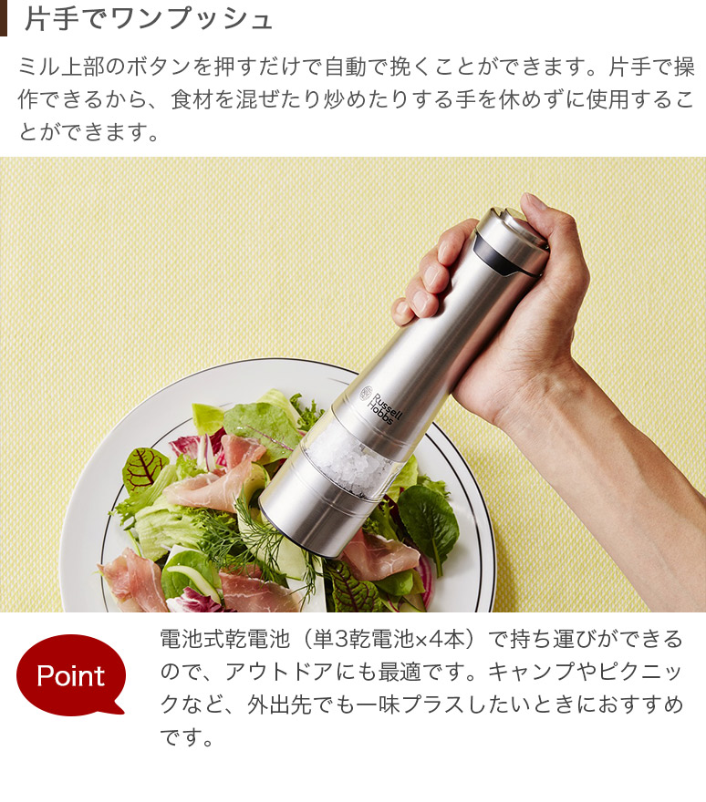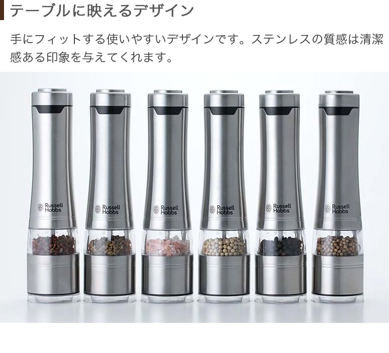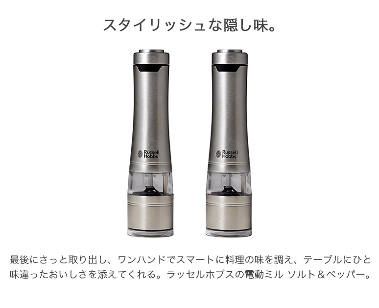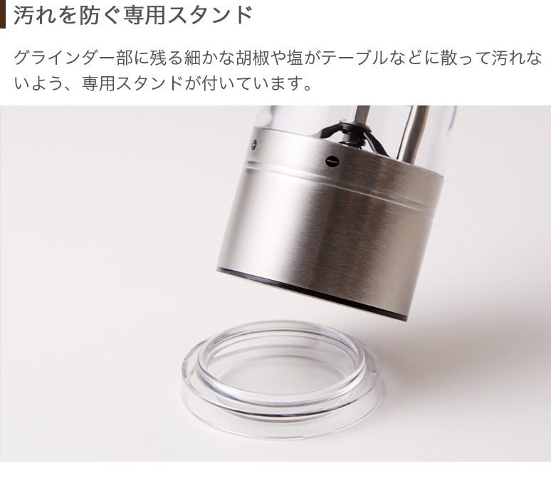 | ● ここがポイント ● ◆最後にさっと取り出し、ワンハンドでスマートに料理の味を調え、テーブルにひと味違ったおいしさを添えてくれます。 ◆ミル上部のボタンを押すだけで自動で挽くことができます。片手で操作できるから、食材を混ぜたり炒めたりする手を休めずに使用することができます。 ◆残量が一目で分かるよう、キャビンは透明になっています。また、広めの充填口により、塩や胡椒を楽に上手に入れることができます。 ◆グラインダー部に残る細かな胡椒や塩がテーブルなどに散って汚れないよう、専用スタンドが付いています。 ◆上部のボタンを押している間はLEDライトが点灯。手もとを明るく照らしてくれるから分量が見やすく、暗いキッチンでも便利に使えます。 ◆錆の心配がなく、岩塩にも使用できる丈夫なセラミック製の刃を採用。また、摩擦熱が生じにくいため、熱で飛びやすい胡椒の香りを保ちます。 ◆粗いものから細かいものまで、好みに合わせた挽き方を自在に調節することができます。 ◆手にフィットする使いやすいデザインです。ステンレスの質感は清潔感ある印象を与えてくれます。 ◆お買い得な2本セットです。 【 仕様 】 ■メーカー型番:7922JP ■カラー:ステンレス ■商品サイズ(外寸):(約)直径60×高さ230mm ■重量:330g(乾電池含まず) ■電源:1.5V 単3乾電池4本(別売) ■材質:ステンレス、セラミック、ABS樹脂、AS樹脂 ■生産国:中国 |