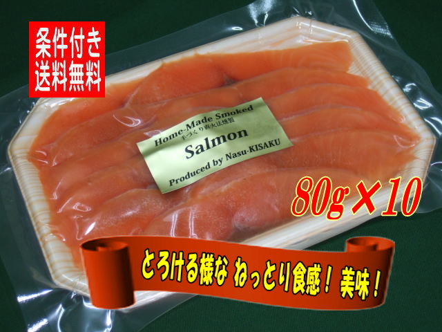 KISAKU スモークサーモン スライス 800g(80g×10) Sサイズ( 原材料:プレミアム サーモンを使用・無添加・ヨーロピアンスタイルの直火法冷燻 )