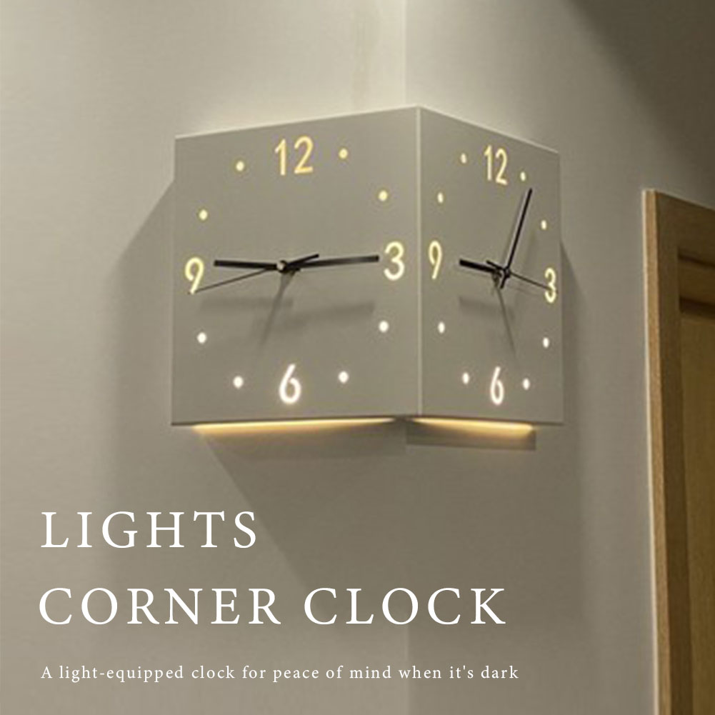 | 商品説明 | コーナーに設置できる両面壁掛け時計。 離れた場所でも見やすい両面デザインは時間を把握しやすく便利に活用いただけます。 センサーライト付きで光るため、電気を消していても時間がすぐにわかります。また、夜間照明としても活躍してくれます。 デザインはシンプルで他のインテリアに馴染みやすいのも嬉しいポイント。 壁へのアクセントとして飾るだけでおしゃれになるディスプレイ兼時計としてご利用ください。 |
