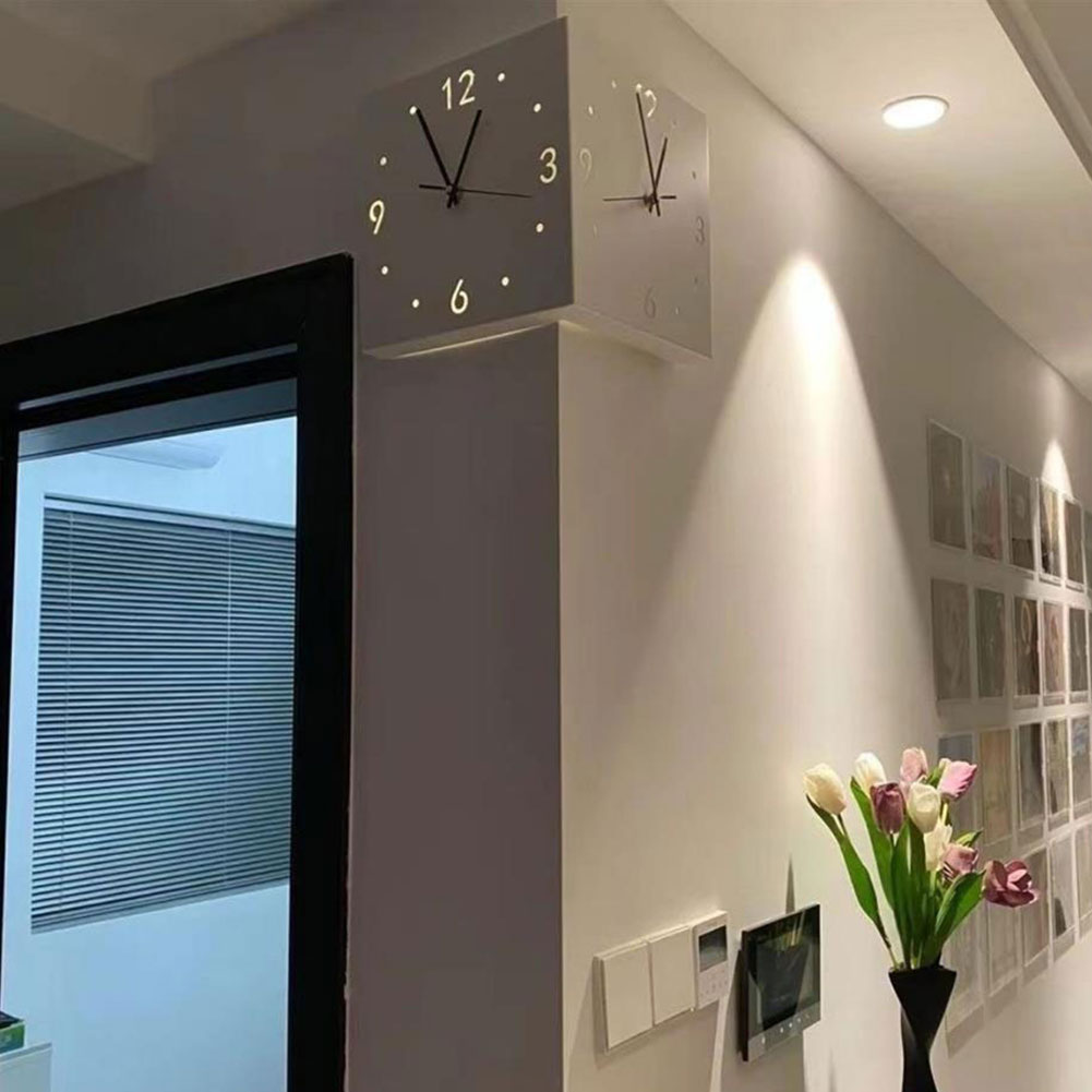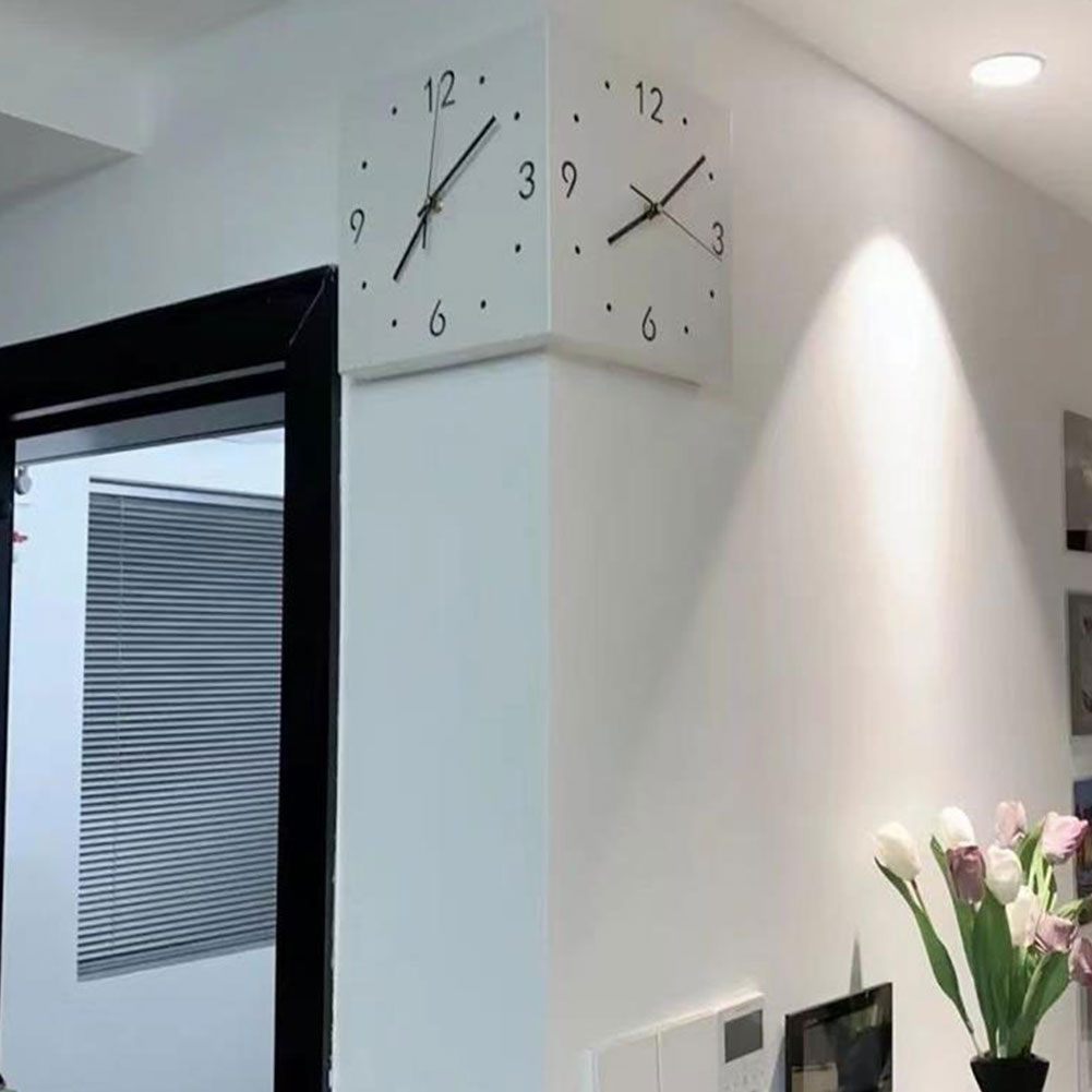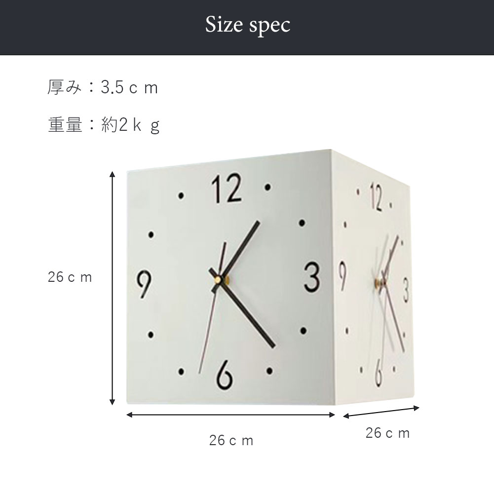 | コーナーに設置できる両面壁掛け時計。 離れた場所でも見やすい両面デザインは時間を把握しやすく便利に活用いただけます。 |