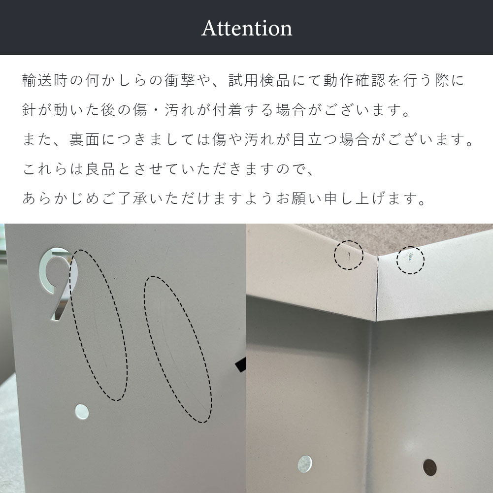 | 注意事項 | ・海外製品につき、小さな欠け・汚れが個体によって存在する場合がございます。製造上の仕様のためご容赦ください。 ・3針(時針 分針 秒針)は取り付けた状態にて出荷いたしますが、輸送時の何かしらの要因により、外れや緩みがある場合がございます。外れや緩みがある場合はお手数ですが、お客様ご自身で取り付けいただきますようをお願い申し上げます。取り付け方は時針→分針→秒針の順に取付ください。※しっかりと固定されていることを確認ください。固定されていない場合針が本体を擦ることで傷や汚れができる場合がございます。 ・本商品は海外製品、かつ商品のデザイン性を重視した為、非常に細い針を使用しております。針が曲がってしまうことも起きうるデザインの為、少しの歪みは仕様範囲内とさせていただいております。針が曲がっている場合、3針のいずれかに引っ掛かり上手く回っていない可能性がございますので、それぞれの針に干渉していないかご確認ください。 干渉している場合、指の腹でそっとまっすぐにしていただくことを、お試しいただけますようお願い申し上げます。 ・製造時期により基本構造に影響のない範囲で本体の厚みが異なる場合がございます。 ・輸送時の何かしらの衝撃や、試用検品にて動作確認を行う際に針が動いた後の傷・汚れが付着する場合がございます。 ・裏面部分は傷・汚れ等が目立つ場合もございます。あらかじめご了承ください。 ・本商品は時計の作動に単三電池2本、ライトの作動に単4電池4本が必要です。※付属しておりませんので、お客様ご自身でご準備いただきますようお願い申し上げます。 ・壁へ取り付ける方法として本体裏面に釘やネジを引っ掛ける窪みがございます。釘やネジ等を壁へ取り付ける備品は付属しておりませんので、お客様ご自身でご準備いただきますようお願い申し上げます。 ・ライトの点灯方法等仕様につきましては説明書を同封しておりますので、ご確認いただきますようお願い申し上げます。 ・本商品はクォーツ式時計です。クォーツ式時計は一般的に磁気や温度変化等の影響を受けることがあり、針の動きが遅れたり、早まったりする可能性がございます。また、当商品は2面の時計がそれぞれ独立して作動する仕様となっているため、「片面が早まる」「片面が遅くなる」などの影響により、2面をを比較した際に針の動きにズレが生じる場合がございます。あらかじめご了承いただけますようお願い申し上げます。 ■商品の撮影には最大限注意を払っておりますが、閲覧時のモニター環境によりましては実際の商品と若干違うお色味に映ることもございます。 |