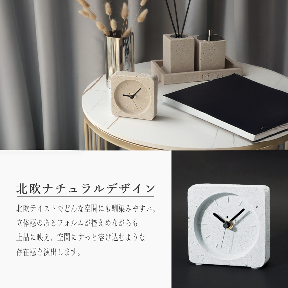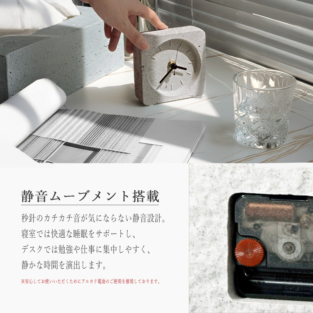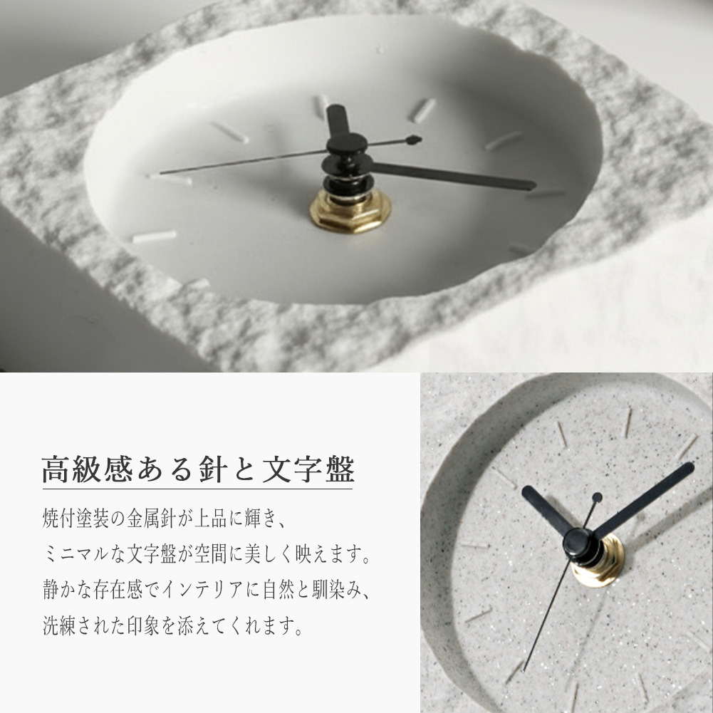 | 商品説明 | マットな質感と優しい曲線フォルムが調和し、自然の温かみを感じさせる落ち着いたデザインが特徴です。 カチカチ音のしない静音ムーブメントを採用しており、リビングや書斎、寝室などあらゆる空間で快適に使用できます。 洞石風の樹脂素材を用い、一点ごとに異なる模様が楽しめるため、まるで自然石のような風合いを再現しています。 コンパクトで設置しやすく、北欧やナチュラル、モダンインテリアにもよく馴染み、贈り物にも最適です。 |
