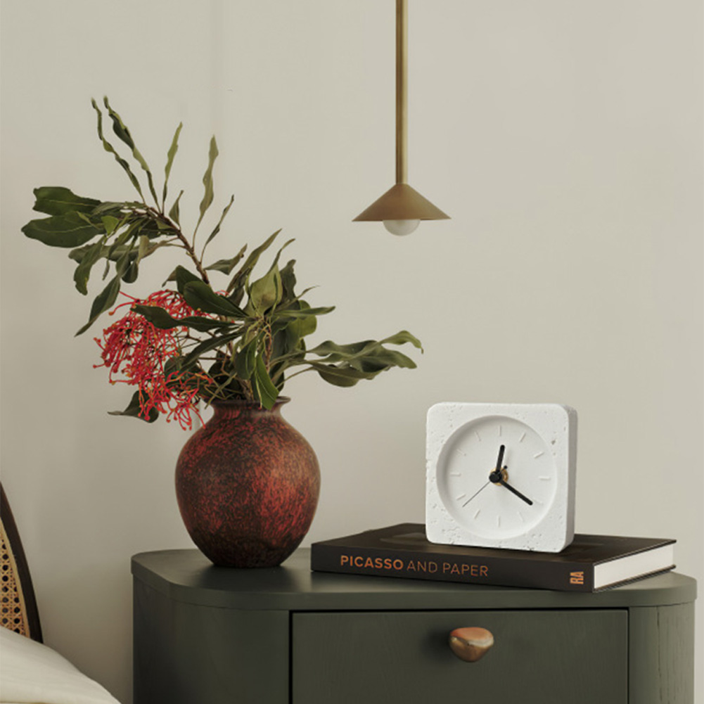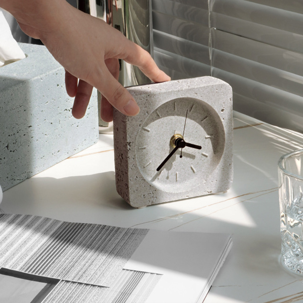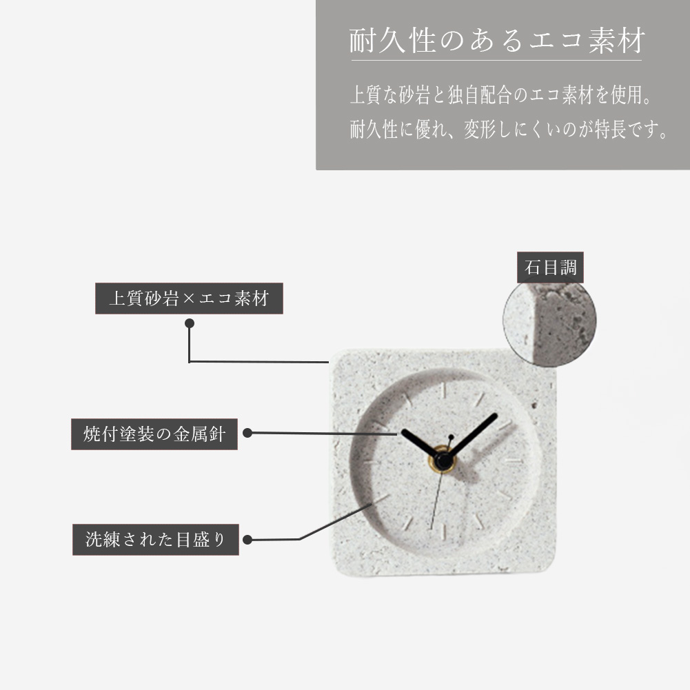 | マットな質感とやわらかな曲線が調和した、ぬくもりある静音クロック。 洞石風の樹脂素材が自然な風合いを演出し、北欧やナチュラルインテリアにも優しく馴染みます。 |