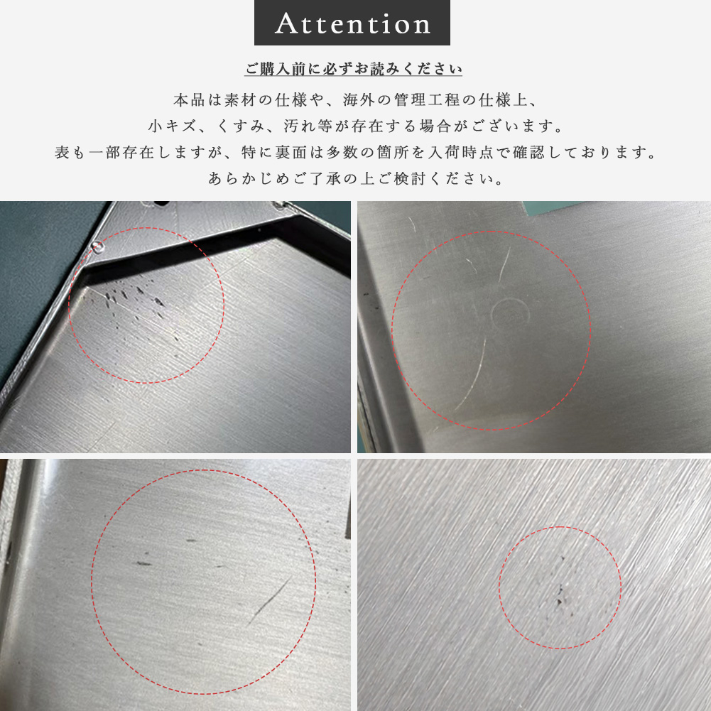 | 注意事項 | ■本品は海外の管理工程の仕様上、小キズ、くすみ、汚れ等が存在する場合がございます。 ■海外製品のため製造工程の都合上、サイズに誤差が生じる場合がございます。 ■本品使うことによる本製品や家財その他への損害に関しては当店では責任を負いかねますので、ご了承ください。 ■商品の撮影には最大限注意を払っておりますが、閲覧時のモニター環境によりましては実際の商品と若干違うお色味に映ることもございます。 |