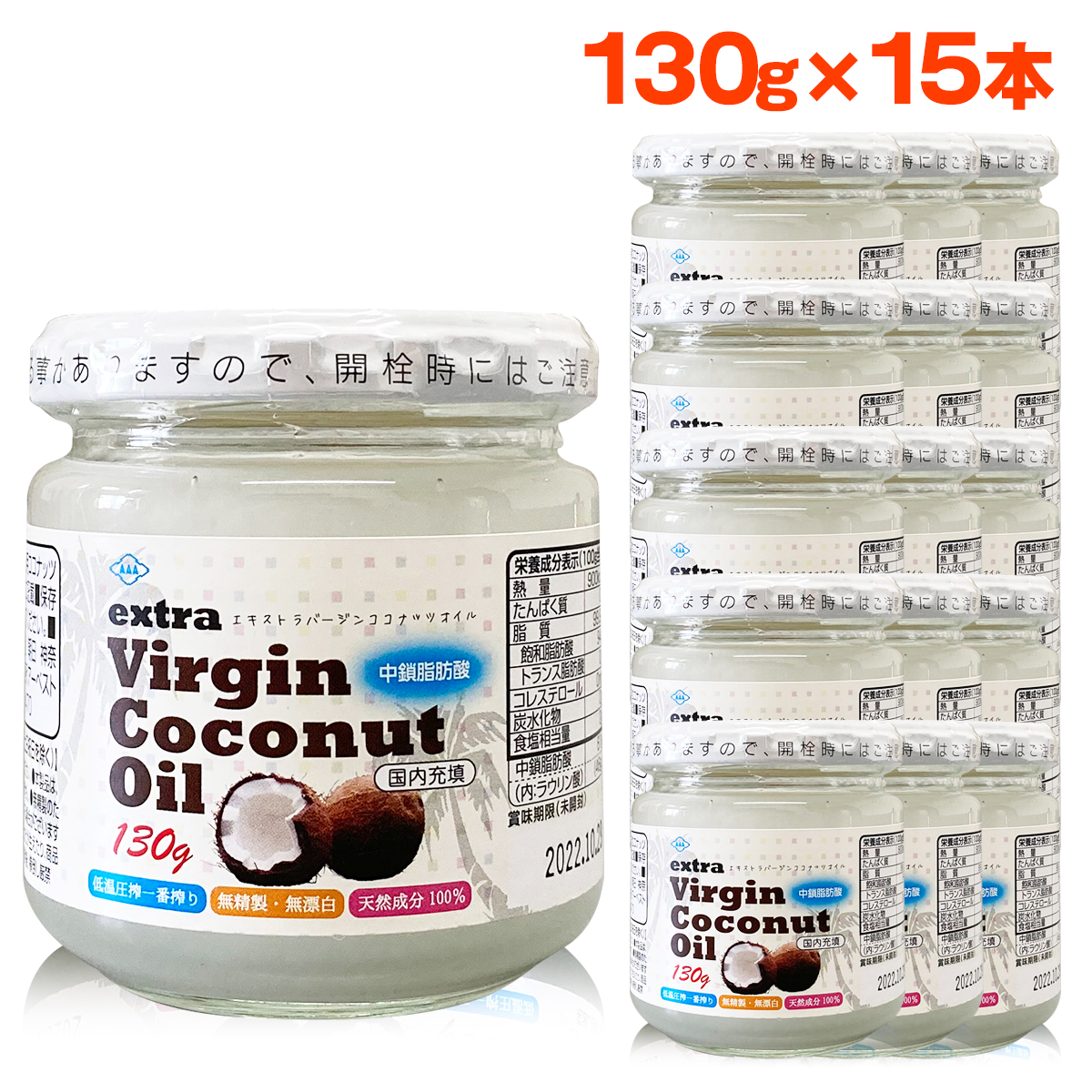 エキストラバージン ココナッツオイル 130g 15個セット 低温圧搾 コールドプレス 中鎖脂肪酸 ダイエット 未精製 無漂白 保存料不使用 スリランカ