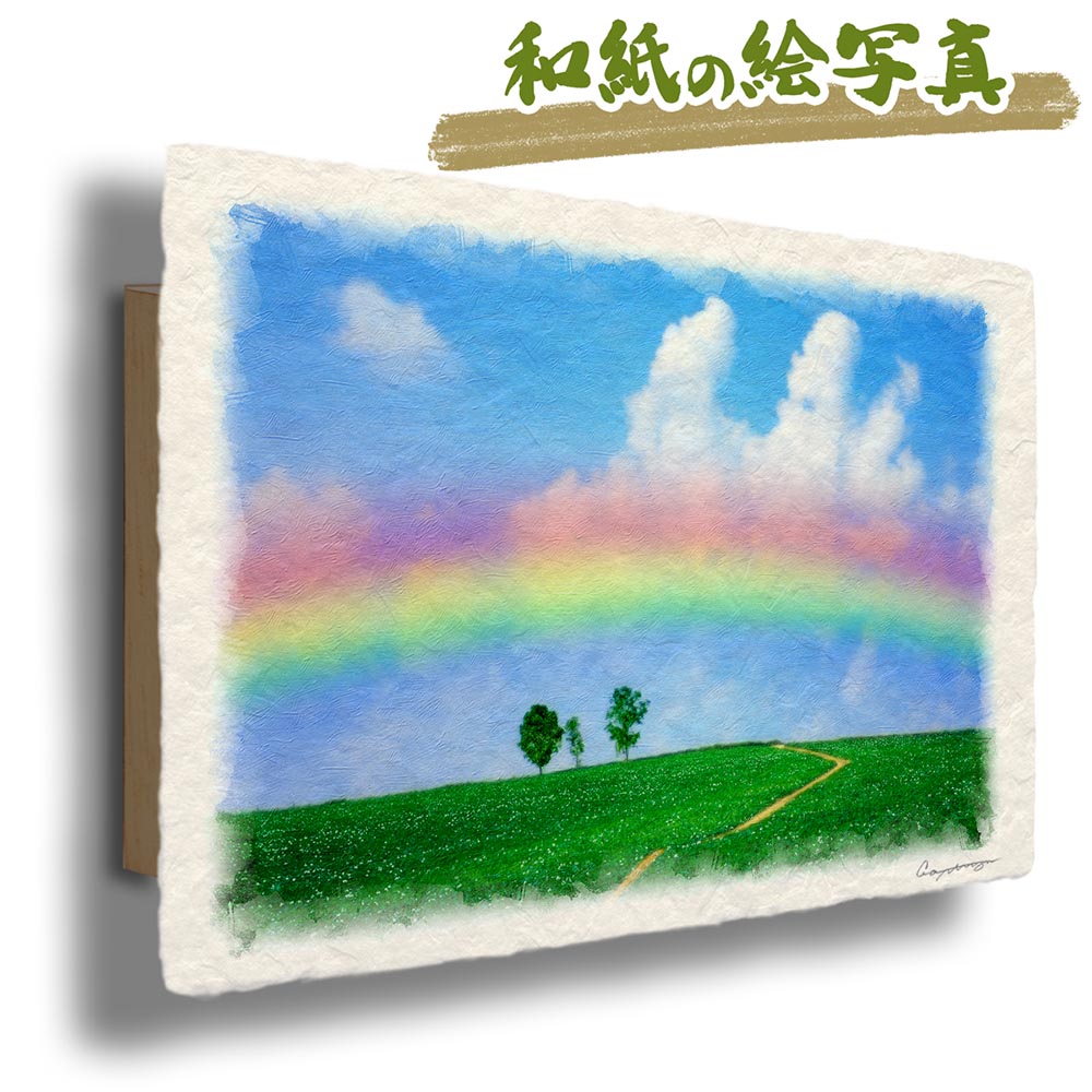 風水 玄関 絵 金運 絵画 トイレ 和紙の絵写真 夏 緑 青 「虹と入道雲と親子の木への道」