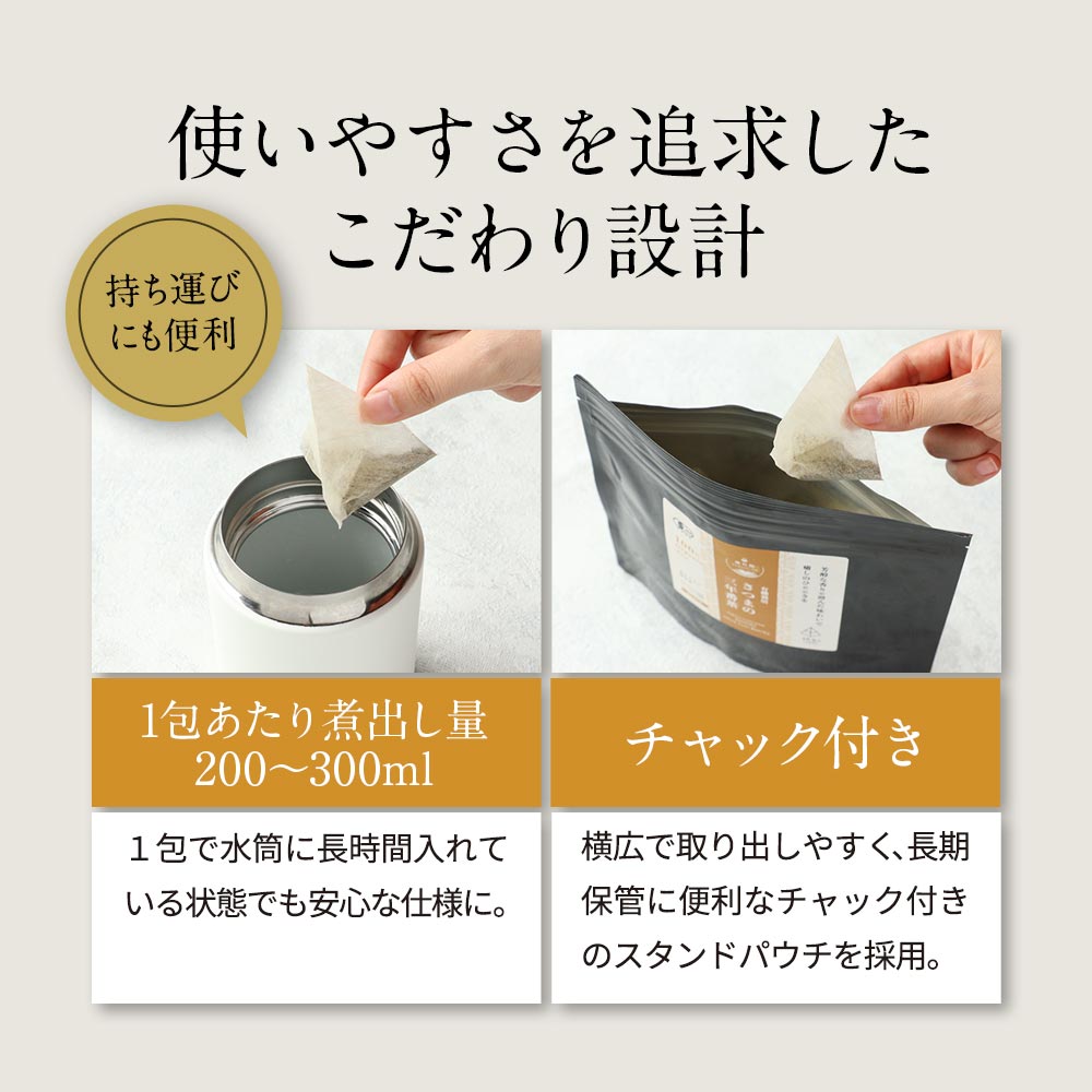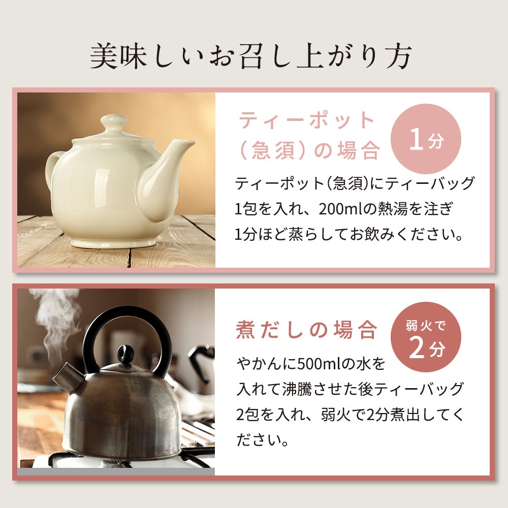 やかんに500mlの水をいれて沸騰させた後2包入れ、弱火で2分ほど煮出してください。