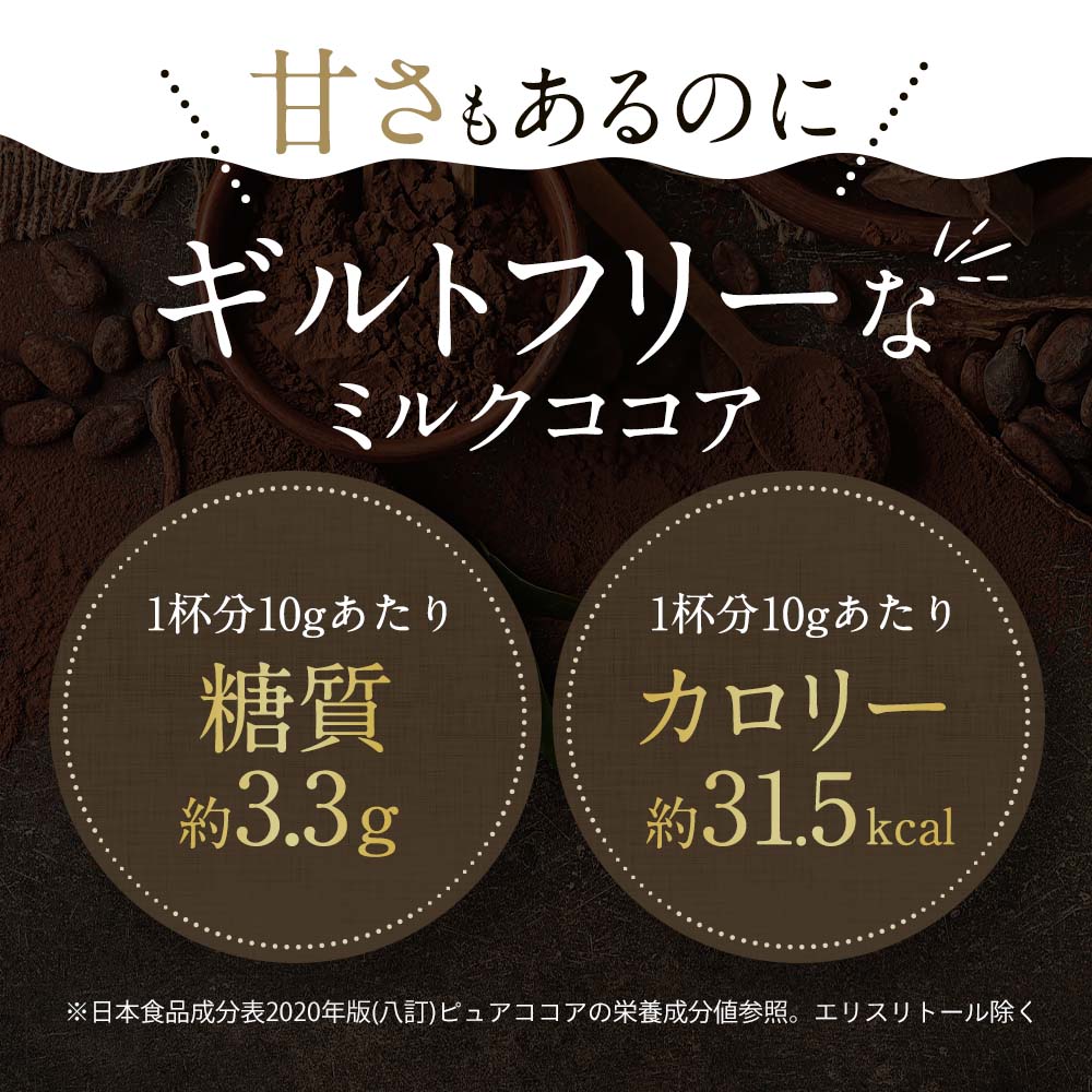 乳等を主要原料とする食品(たんぱく質濃縮ホエイパウダー、脱脂粉乳、乳糖、植物油脂)(国内製造)、ココアパウダー、エリスリトール/甘味料(スクラロース)、(一部に乳成分を含む)