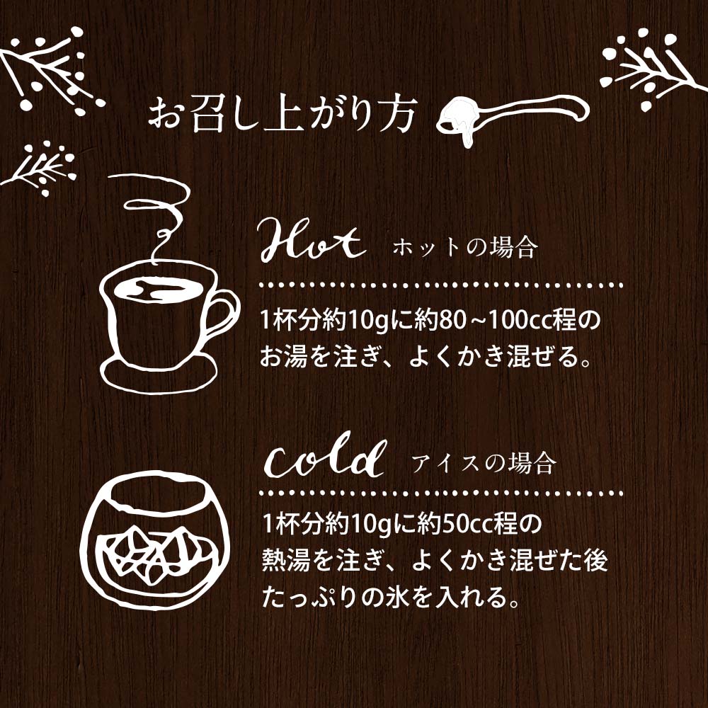 アイスの場合:1杯分約10gに約50cc程の熱湯を注ぎ、よくかき混ぜた後たっぷりの氷を入れる。