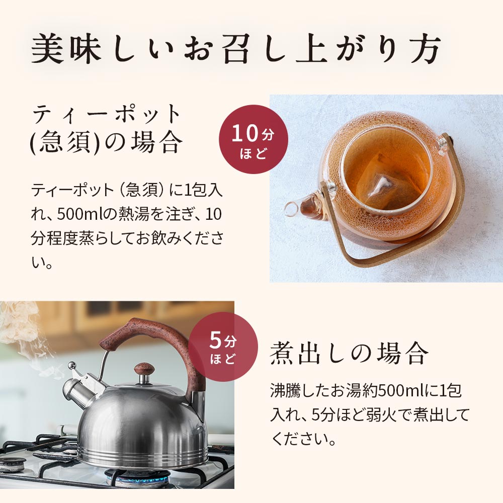 ■ティーポット(急須)の場合:ティーポット(急須)に1包入れ、500mlの熱湯を注ぎ、10分程度蒸らしてお飲みください。