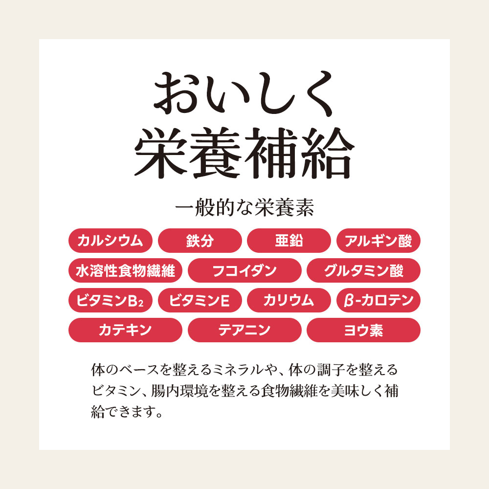 1杯(2g)当たり(推定値):熱量3.4 kcal / たんぱく質0.094 g / 脂質0.006 g / 炭水化物0.74 g / 食塩相当量1.12 g