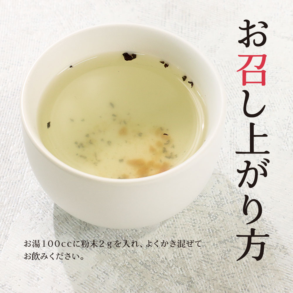 お湯100ccに粉末2gを入れ、よくかき混ぜてお飲みください。