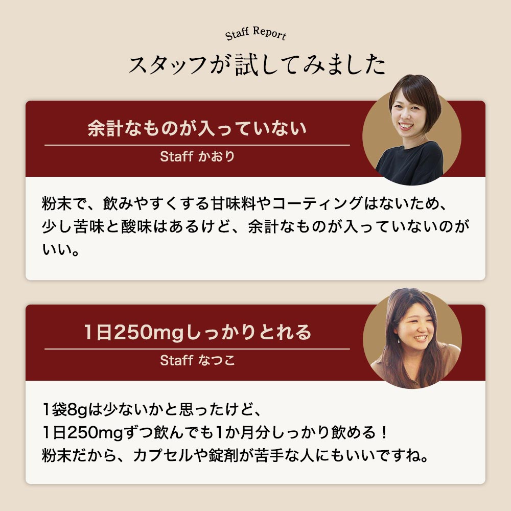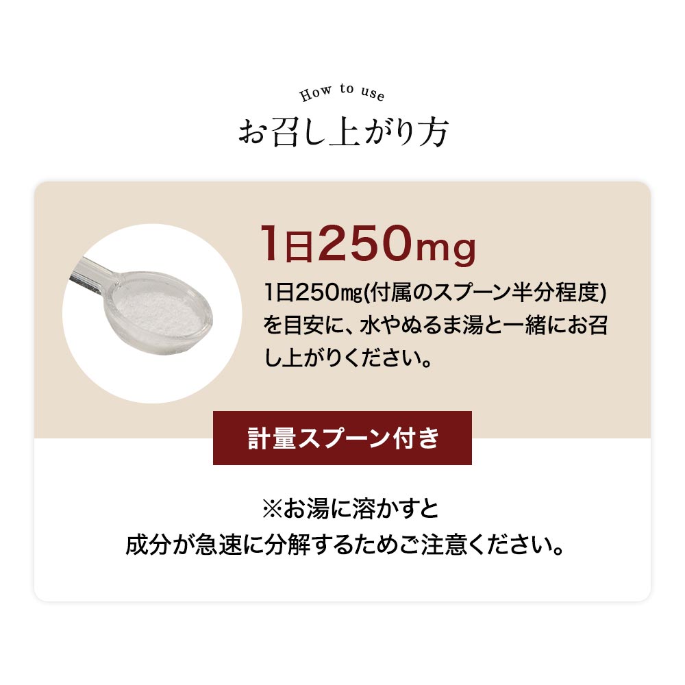 ●1日あたり250mg(付属のスプーン半分程度)を目安に、水やぬるま湯と一緒にお召し上がりください。