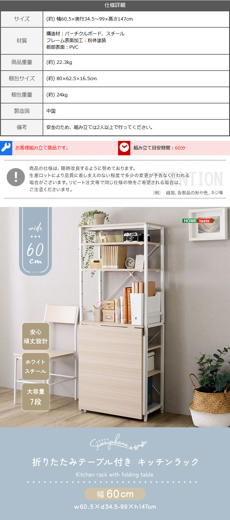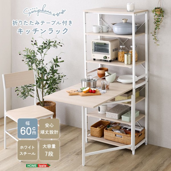 折りたたみ テーブル付 キッチン ラック 幅60.5cm 棚 収納 作業台 テーブル アジャスター付 ホワイト フレーム レンジ台 ストック すきま 台所 家具 送料無料