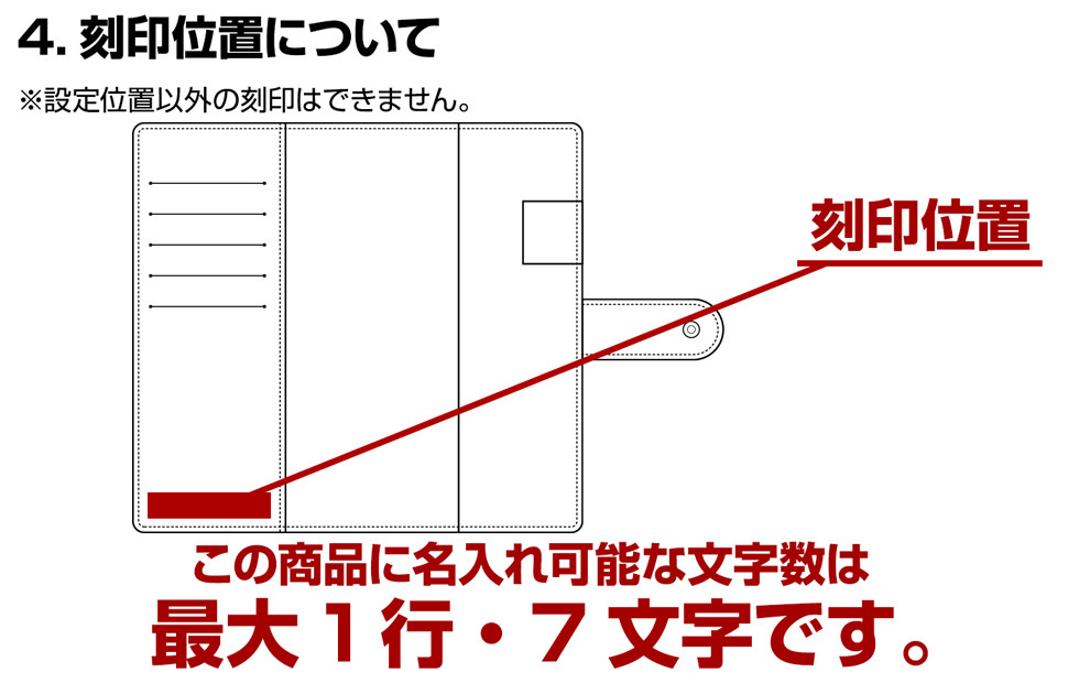 | 名入れについて | ・名入れご希望の場合は、オプション選択肢で【名入れする+550円】をお選びください。 設定位置以外の刻印はできません。 文字数:1行最大(英数字で)7文字 アルファベット、数字、記号( . & )のみ刻印可能 ※文字によって版の幅が異なるため、組み合わせ次第では、刻印出来る文字数が短くなる場合もございます。 色によっては、 刻印内容が目立たないこともあります。 一点ずつ職人さんによる刻印で、出来る限り丁寧な仕上がりを心がけておりますが、手作業による天然皮革への刻印ため、スペルの絶対水平はお約束しておりません。 また、書体の文字間バランスにつきましては、刻印ミスではございませんので、予めご了承下さいませ。上記の理由によるご返品・交換は一切承っておりません。 この商品はお客様のご注文を受けてからすぐに刻印をいたしますので、ご注文後の変更・キャンセルはお受けできません。内容を充分ご確認の上、ご注文いただきますようお願いいたします。 商品の仕上がりがお客様のイメージと異なる場合もご返品は出来ません。 備考欄ご記入漏れ、または不明瞭な点があった場合はメールにてご連絡いたします。 |