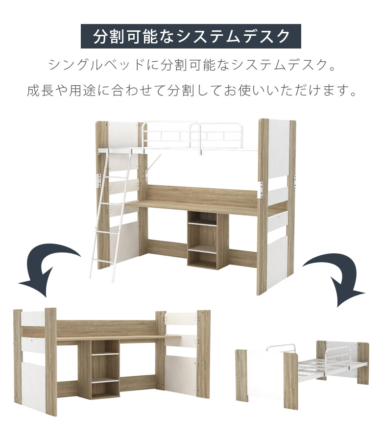 システムベッド 子供 大人 学習机 ロフトベッド ハイタイプ シングル おしゃれ 収納 木製 はしご付き 省スペース 分割 ベッド下 机付き アイアン スチール 収納
