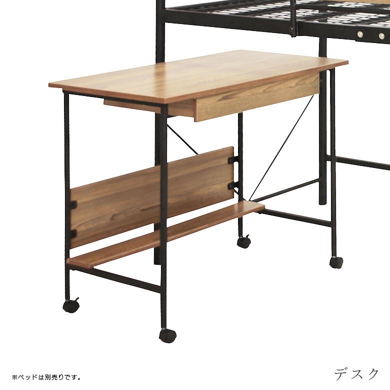ちょっぴりヴィンテージなブルックリンスタイルのハイベッド。分割してシングルベッドにもできる。ウッドとスチールがおしゃれ ベッド下のフリースペースを有効活用。