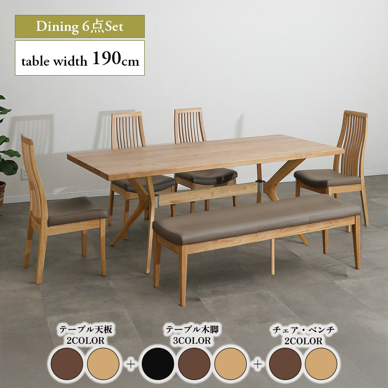 ダイニングテーブルセット 幅190cm 6人掛け ダイニングチェア 4脚セット ダイニングベンチ 150cm 木製 ホワイトオーク