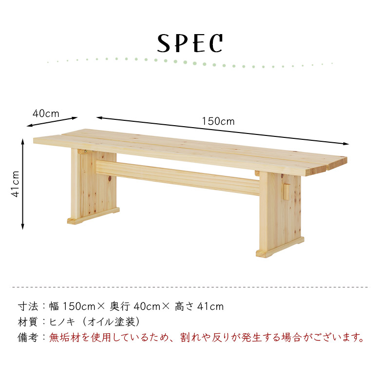 ダイニングベンチ 長椅子 ベンチ 150cm 2人掛け ゆったり 木製 無垢 天然木 板座 ヒノキ ひのき 檜 オイル塗装 和風 和モダン