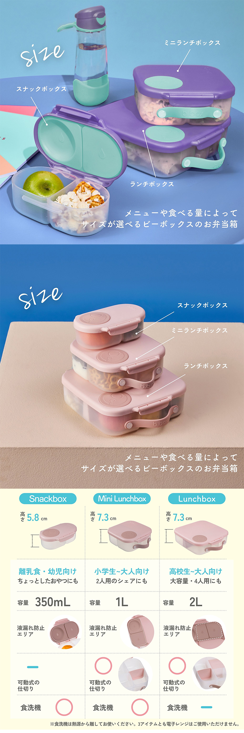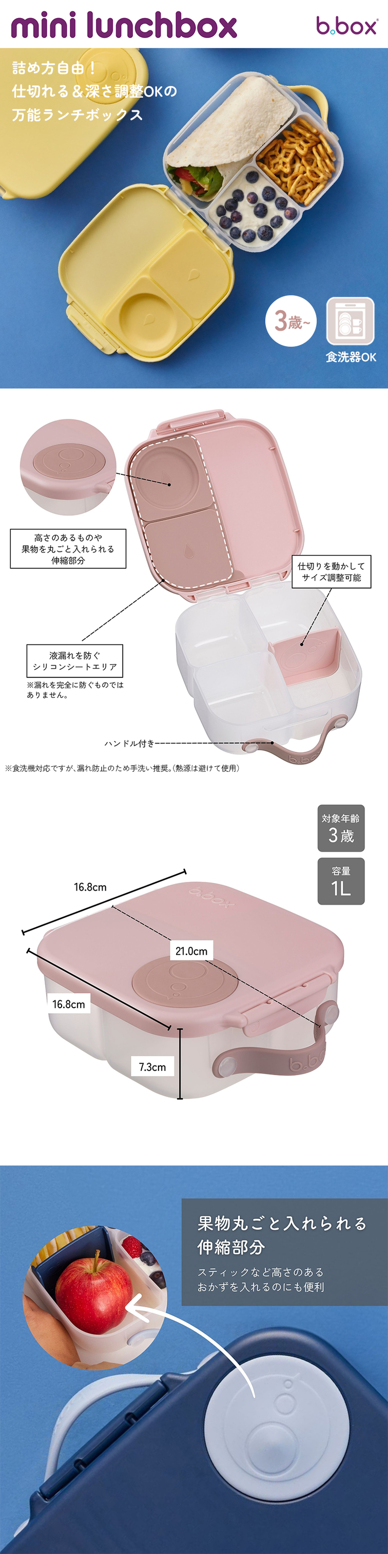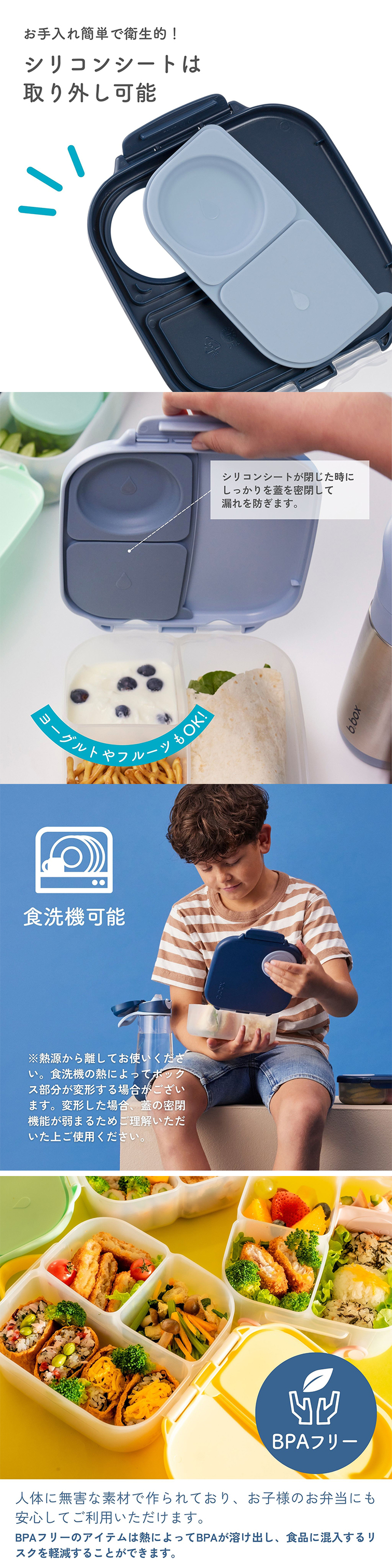 | 仕切りと深さがあるミニランチボックスは、ご飯はもちろん、パスタやサンドウィッチなどの主食も入れられる万能型のお弁当箱です。 ミニランチボックスは一箇所、可動式の仕切り部分があります。 深さを使用して詰める量を調整できるので、子どもから大人まで幅広い年齢層に対応できます。 ロック部分は一箇所のみで蓋の開け閉めが楽になっています。 さらに蓋の裏には、液漏れをしにくくするシリコン製のシート状のパッキンが付属しており、 フルーツやサラダなど汁漏れが気になるメニューも一緒に盛り付けることができます。 メインのものと分けずに済むので、洗い物も少なくなる上、環境にも優しいアイテムです。 |