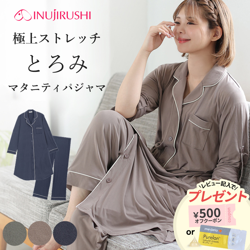 | 【とろみらくちんパジャマ】 伸縮性に優れた柔らかなとろみ生地 出産準備・産後の授乳便利ない犬印本舗のマタニティパジャマ なめらかなとろみ感のある生地で、伸縮性に優れています。 テーラード×パイピングの大人かわいいデザイン。 大きなお腹もすっぽり包んでくれる楽ちんな着心地です! |