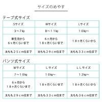 | テープ式布おむつカバーのサイズ | 【Sサイズ】3〜7kg 【Mサイズ】8〜11kg 【Lサイズ】10kgから