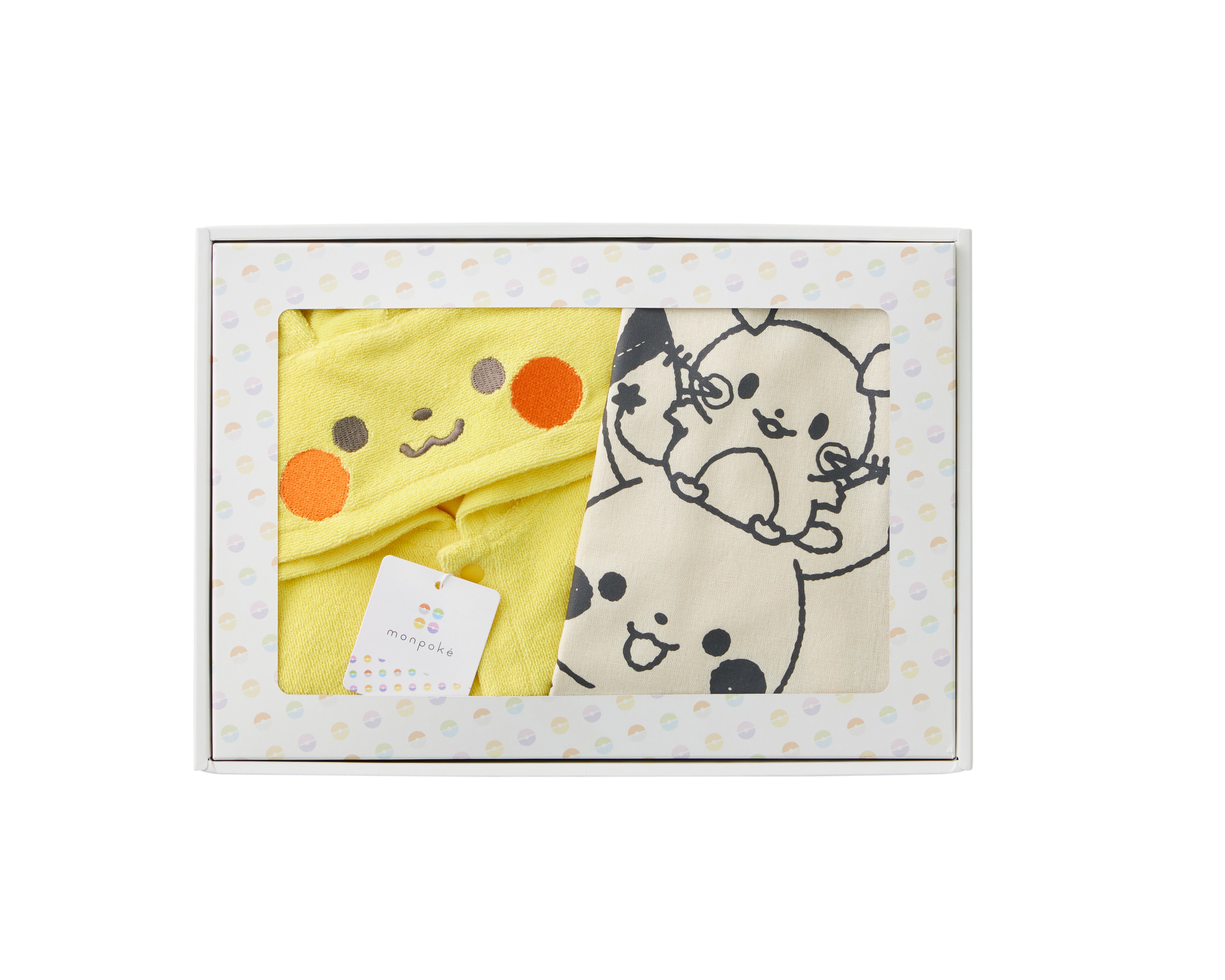 フード部分がピカチュウの顔になったカバーオールと手提げにもなる巾着袋のギフトセット。