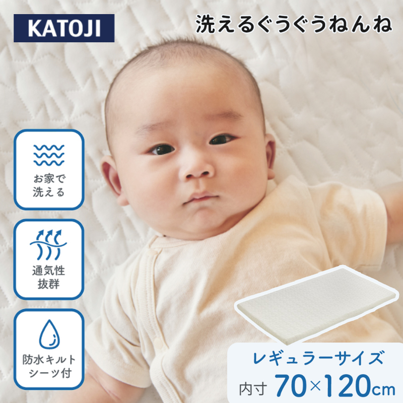 | ・マットレスの中材には、立体的な網状構造を採用。 高い反発力で赤ちゃんの体をしっかり支えながら、体圧をバランスよく分散し、寝姿勢を安定させます。耐久性にも優れており、長く安心してお使いいただけます。 また、空気の通り道が多いため通気性も抜群。ムレにくく、季節を問わず一年中快適な寝環境を保ちます。 ・中材を包むカバーには、通気性のあるメッシュ素材を使用。 適度な厚みを持たせることで、やさしい寝心地にも配慮しました。 ・付属の防水キルトシーツは、「防水シーツ」「キルトパッド」「フィットシーツ」の3役を1枚にまとめた3in1仕様。 これまで3枚を重ねてセットしていた敷き方を、1枚で簡単に行えます。 お世話の合間でも手間なく準備でき、洗い替えの管理も楽になります。 ・中材(詰め物)はお家で水洗いが可能。 さらに内カバー(中材カバー)と防水キルトシーツは、液温40℃を限度として洗濯機での弱い洗いに対応しています。(洗濯ネットご使用推奨) 汚れてしまってもご自宅で手軽にお手入れができ、マットレスの中までいつでも清潔に保てます。 赤ちゃんの「ぐうぐうねんね」を、毎日気持ちよく。 眠りの質と使いやすさを大切にした、KATOJIならではのベビーマットレスです。 |