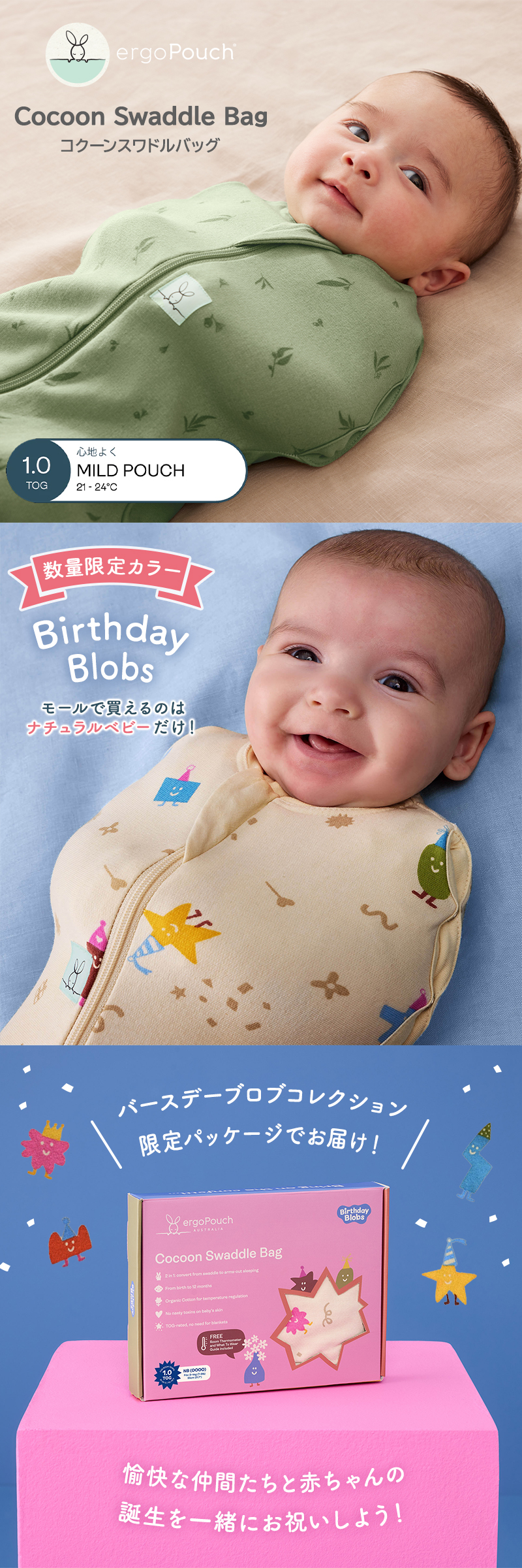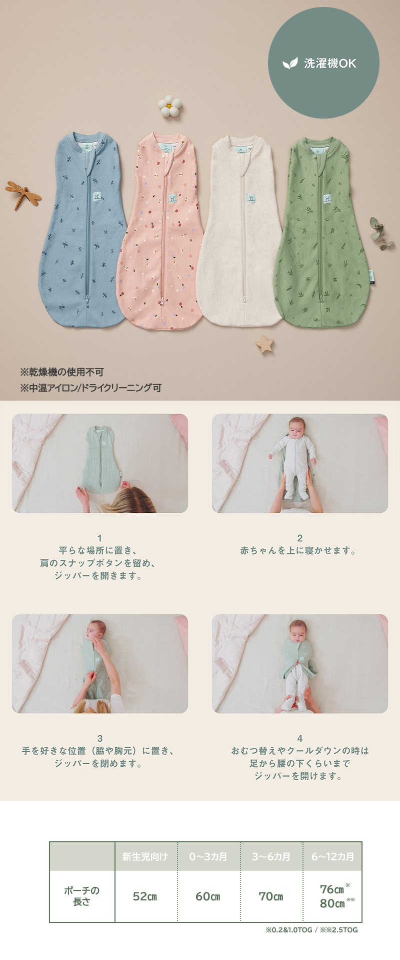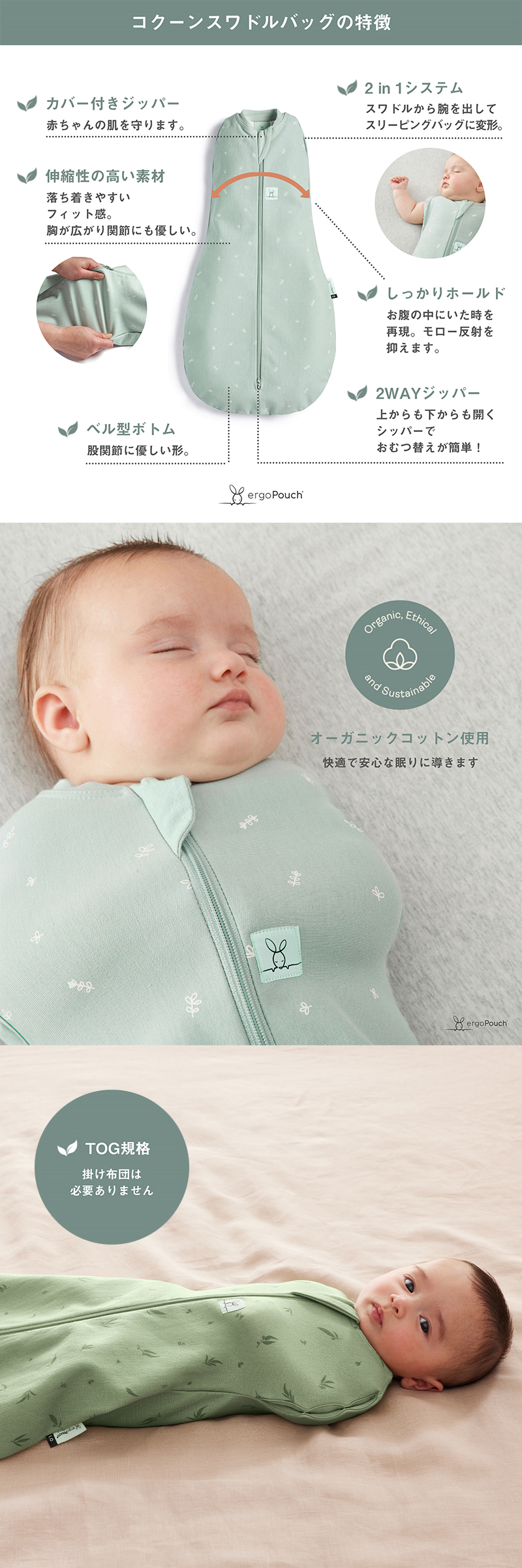 | 【コクーンスワドルバッグ 1.0TOG】 新生児から寝返りが始まった赤ちゃんにおすすめです。 1.0TOGランクの暖かさで、赤ちゃんにぴったりフィットし、安全に包み込みます。 エルゴポーチのコクーンスワドルバッグは、着せやすくて脱がせやすい”巻かないおくるみ”です。 巻かずにジップするため、おくるみのように解けてしまうことがありません。 ※1.0TOG:室温21〜24℃の使用がおすすめです。 室温に合わせて、スワドルの中に肌着やロンパースなどのレイヤーを着せてあげましょう。 【TOGとは】 TOGとはThermal Overall Gradeの略で、寝具や寝装品の断熱性・保温性を表す単位です。簡単に言うと、TOGの数値が低いほど生地が軽く、高いほど中綿や保温性が高いということです。 TOGが高いほど、中綿が多く、保温性が高いということになります。赤ちゃんは大人のように体温調節ができないので、TOGランクの生地は重要です。 |