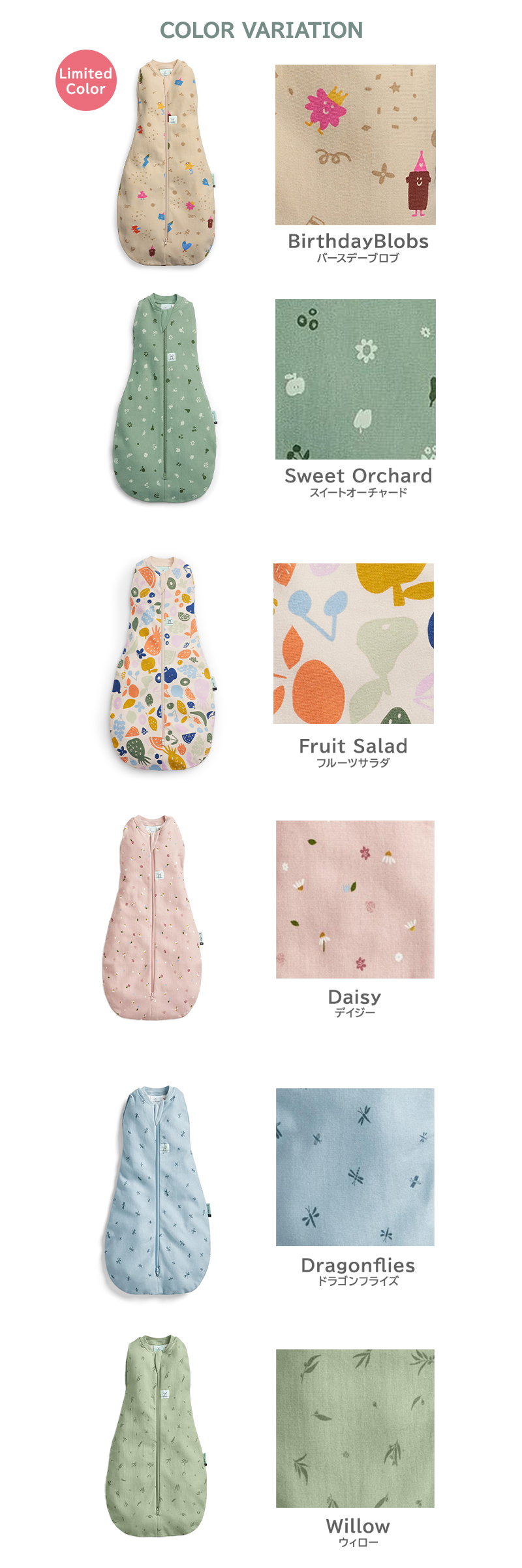 | 0-3Months(3-6kg)、3-6Months(6-8kg)、6-12Months(8-10kg)の4タイプ |
