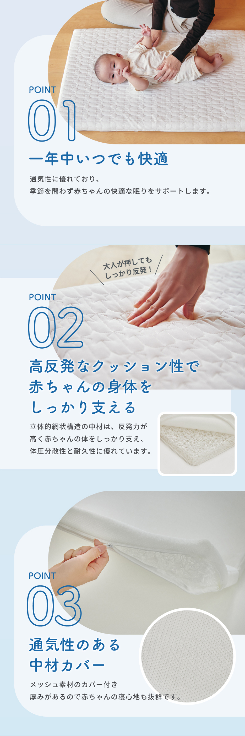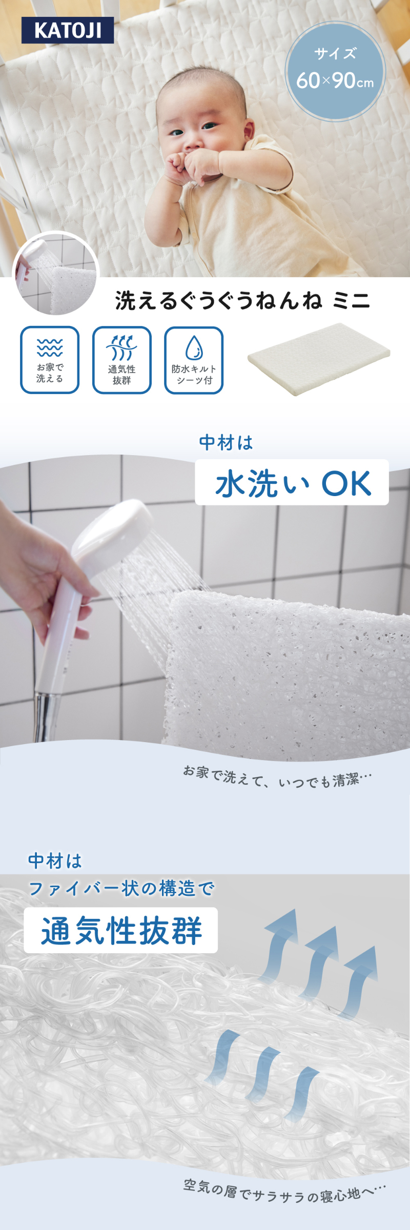 | ・マットレスの中材には、立体的な網状構造を採用。 高い反発力で赤ちゃんの体をしっかり支えながら、体圧をバランスよく分散し、寝姿勢を安定させます。耐久性にも優れており、長く安心してお使いいただけます。 また、空気の通り道が多いため通気性も抜群。ムレにくく、季節を問わず一年中快適な寝環境を保ちます。 ・中材を包むカバーには、通気性のあるメッシュ素材を使用。 適度な厚みを持たせることで、やさしい寝心地にも配慮しました。 ・付属の防水キルトシーツは、「防水シーツ」「キルトパッド」「フィットシーツ」の3役を1枚にまとめた3in1仕様。 これまで3枚を重ねてセットしていた敷き方を,1枚で簡単に行えます。 お世話の合間でも手間なく準備でき、洗い替えの管理も楽になります。 ・中材(詰め物)はお家で水洗いが可能。 さらに内カバー(中材カバー)と防水キルトシーツは、液温40℃を限度として洗濯機での弱い洗いに対応しています。(洗濯ネットご使用推奨) 汚れてしまってもご自宅で手軽にお手入れができ、マットレスの中までいつでも清潔に保てます。 赤ちゃんの「ぐうぐうねんね」を、毎日気持ちよく。 眠りの質と使いやすさを大切にした、KATOJIならではのベビーマットレスです。 |