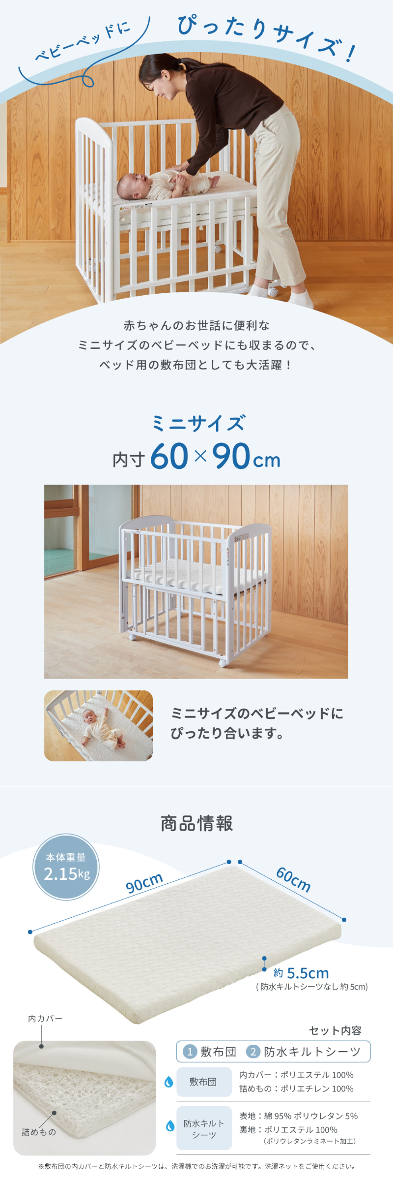 | 敷布団:60×90cm 厚み:約5cm(シーツなし)、約5.5cm(シーツあり) 防水キルトシーツ:60×90cm |