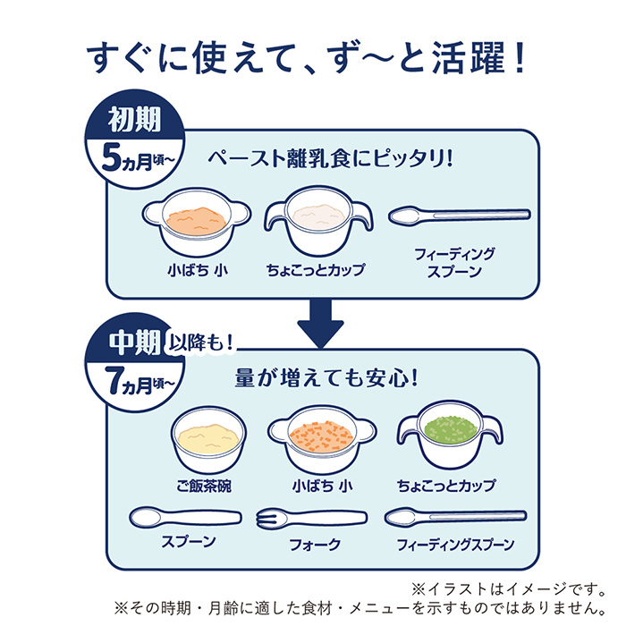 初期の少量ペーストからご飯に麺、手づかみ食べも!完了後も長く使えます。