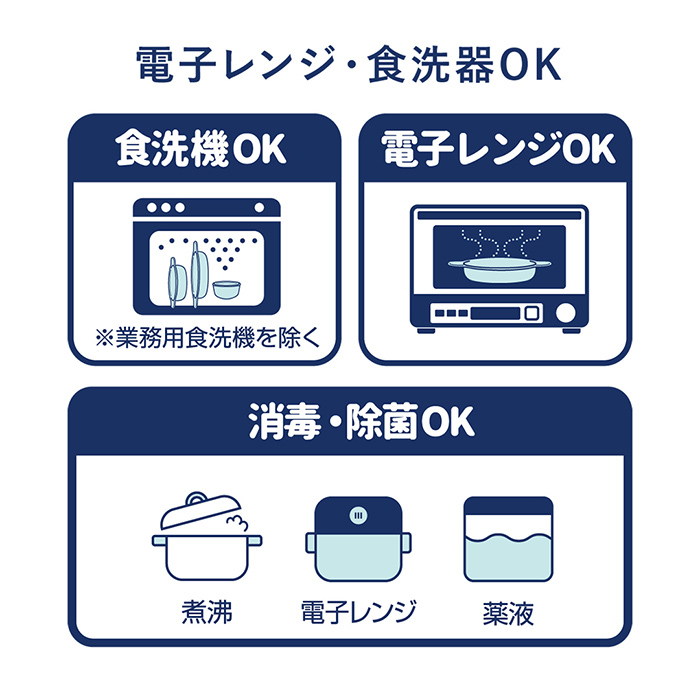 | お手入れ方法 | 電子レンジ、食洗機使用可能 煮沸・電子レンジ・薬液での消毒、除菌可能 ※電子レンジ・消毒・除菌はおはしを除く。