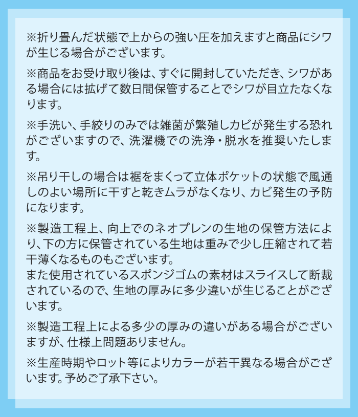 ・製造工程上、工場でのネオプレンの生地の保管方法により、下の方に保管されている生地は重みで少し圧縮されて若干薄くなるものもございます。