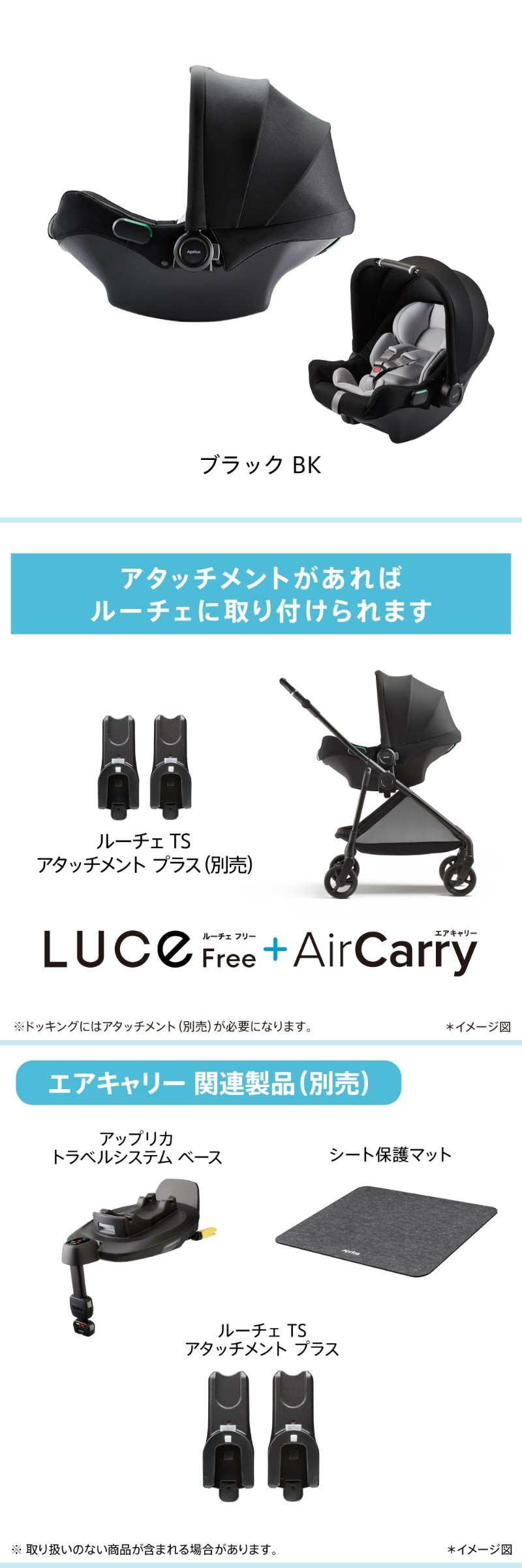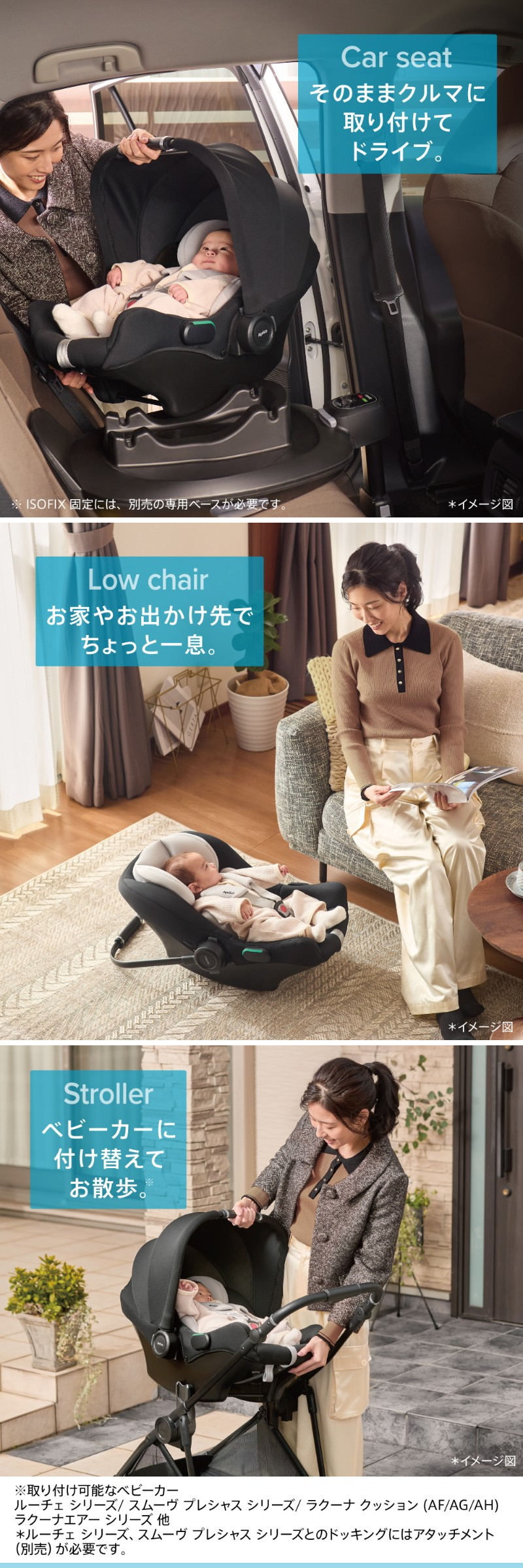 寝かせたまま、好きなところへ。 軽量3.0kg,だから、クルマへ、ベビーカーへ、お家へ、 寝かせたままスムーズに移動できます。 マシュマロGキャッチで安全面もしっかり。3重構造で柔らかい頭を守ります。 衝撃吸収材「マシュマロGキャッチ」なら・ ・高さ60cmから落としても割れない衝撃吸収力 ・ドア側の衝撃から、使い終わるまで※2、3重のまま守り続ける。 ※1 UN規則No.129(改良型幼児拘束装置) ※2 身長83cmまで 別売りのアップリカトラベルシステム ベース使用で、ISOFIX固定も可能。 またより使いやすくなったルーチェTSアタッチメント プラスを使用でルーチェベビーカーに取り付け可能です。 |