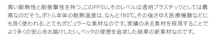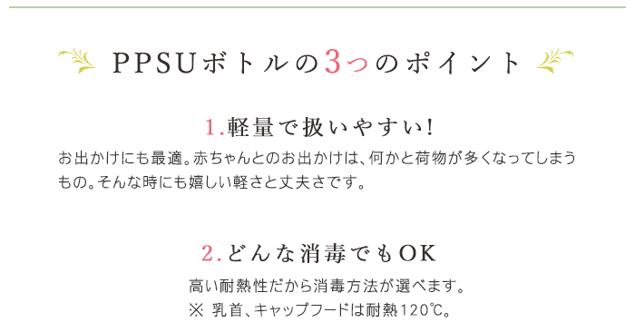 ※PPSU製の哺乳びんに、まれに小さな黒点が浮かぶものがございます。この黒点は、原料を製造する過程でやむを得ず変色したものが混じったものであり、決して有害なものや不衛生なものではございません。ご使用上何ら問題はございませんので安心してお使いください。
