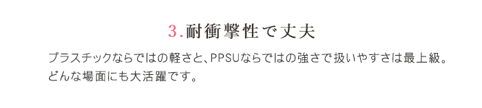 180℃の耐熱温度があり、医療機器にも使用されている実績のある安全なプラスチック素材です。