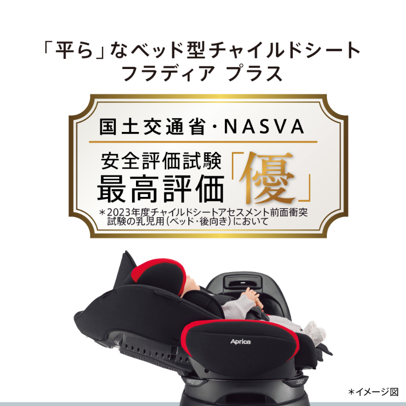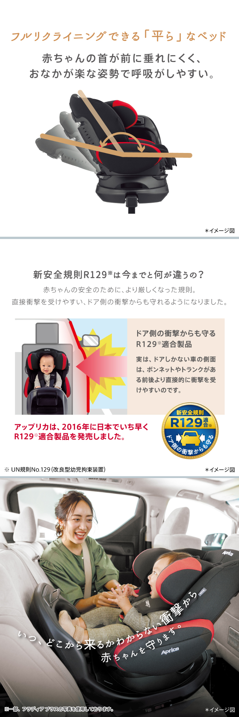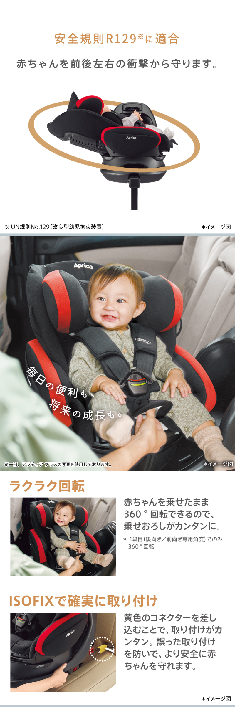 | 赤ちゃんの呼吸を守り、衝撃からも守る。 フラディア プラス プレミアム 〇乗せおろしや取り付けをスムーズにする工夫で、毎日のお出かけを快適に。 ・ラクラク回転 赤ちゃんを乗せたまま360°回転できるので、乗せおろしがカンタンに。 ※1段目(後向き/前向き専用角度)でのみ360 °回転 ・ISOFIXで確実に取り付け 黄色のコネクターを差し込むことで、取り付けがカンタン。誤った取り付けを防いで、より安全に赤ちゃんを守れます。 〇生まれてすぐから4歳頃までずっと、3ステップで理想的な姿勢をサポートします。 ・新生児から「平ら」なベッド ぐらぐらな首と頭を守り、楽に呼吸できる姿勢に ・2歳頃まで後向きシート 発達し始める頃に合わせ、足が自由に動かせる姿勢に ・4歳頃まで前向きシート ぐんぐん育つからだを支え、いつも安定した姿勢に 〇サイドマモールクッション ・サイドマモールクッションが、赤ちゃんの未熟なからだを守ります。 〇フレックスシェード ・紫外線を99%カット。皮膚が薄く、紫外線に敏感な赤ちゃんを守ります。 ※シェード部において、メッシュ部を除く 〇イージーウォッシュ ・いつでも清潔。シートは洗濯機で洗えます。 ※洗濯方法については、取扱説明書をご確認ください 〇やわらかクッション ・やわらかなクッションで快適な座り心地。 〇肩パッド ・取り外し可能な肩パッドつき |