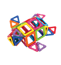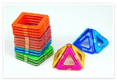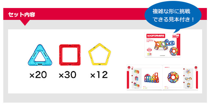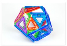 | マグフォーマーは幾何学形を磁石でつなげるブロック。平面でつなぎ合わせるのはもちろん、平面で作った展開図の重心を見つけて持ち上げるだけで、複雑な立体に変身!磁石ならではの簡単でスピーディーな変化が楽しめます。正三角形と正方形のみの、遊びやすいセット。磁力を操り簡単な造形遊びが楽しめます。 |