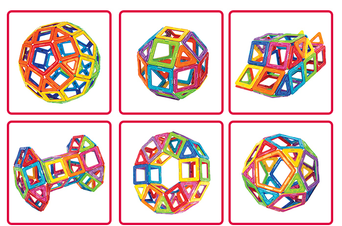 | 磁石でくっついているのでいっきに崩れてしまいません。 | 全く異なる形になったことの発見をしたり。 | 図形の面白さを遊びながら感じることができます。 |