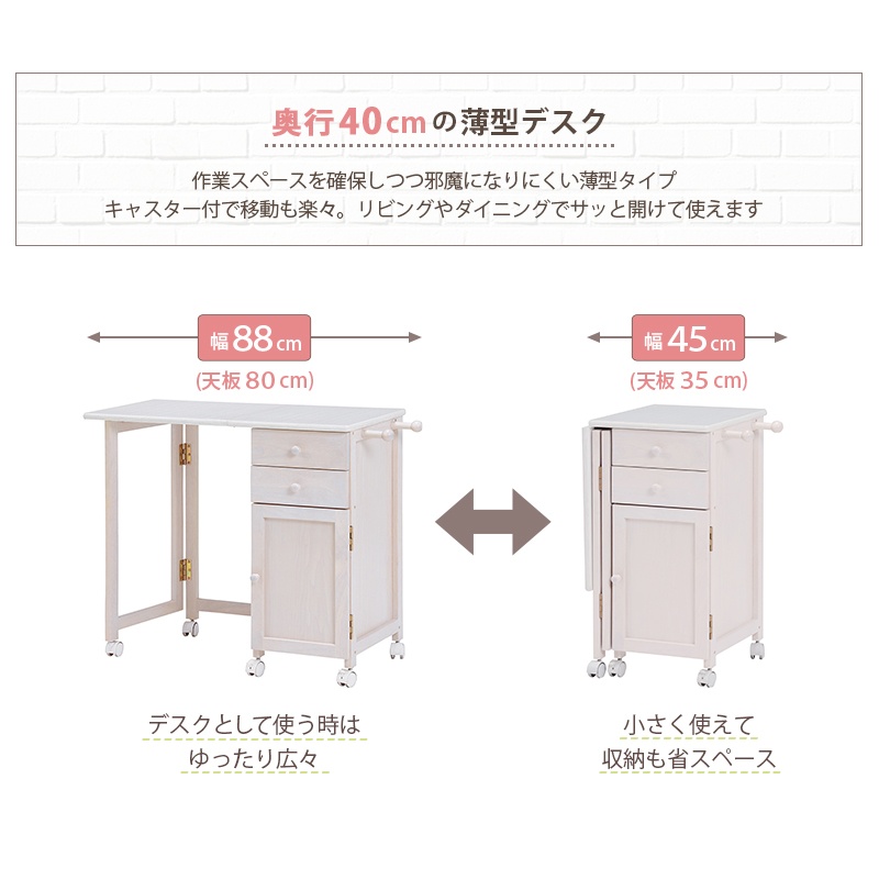 使わないときは天板をたたんで収納できるキャスター付きデスク。