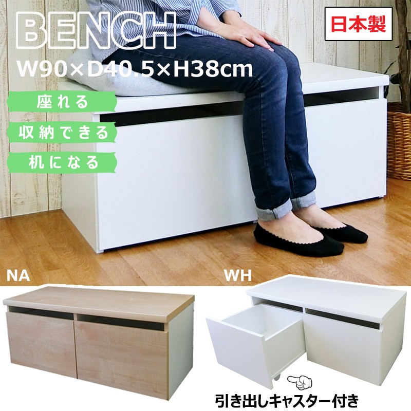 収納ベンチ キャスター付き おしゃれ ベンチ収納 引き出し キャスター 付 ベンチ 収納 ボックス 木製 日本製 幅 90 高さ 38 cm